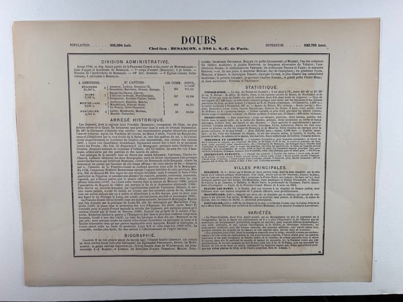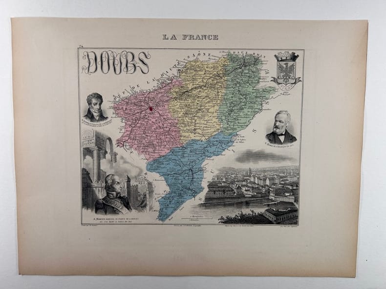Paris J. Migeon, Libraire -Editeur, Carte ancienne de toute fraîcheur gravée sur acier, imprimée sur papier fort et accompagnée de sa notice historique, biographique, statistique, etc.. sur une feuille distincte. Format de la carte, marges comprises : 26x35cm.
