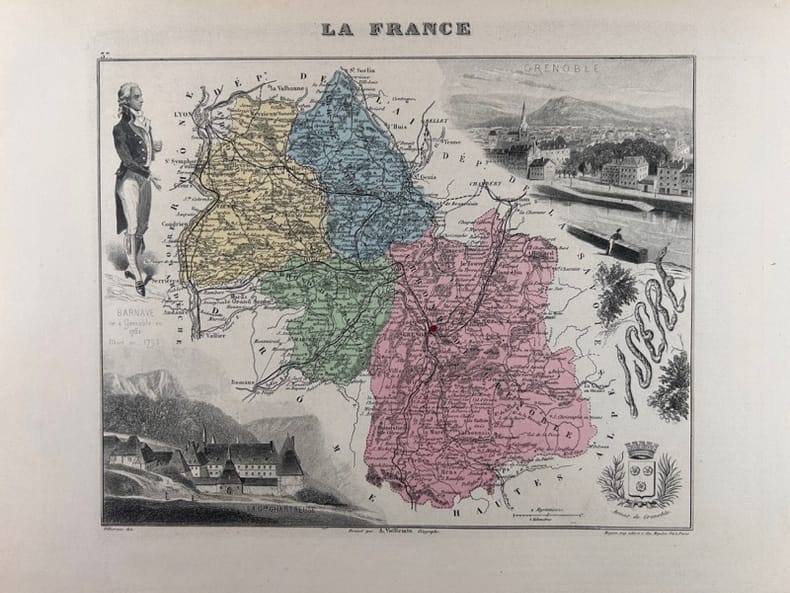 Paris J. Migeon, Libraire -Editeur, Carte ancienne de toute fraîcheur gravée sur acier, imprimée sur papier fort et accompagnée de sa notice historique, biographique, statistique, etc.. sur une feuille distincte. Format de la carte, marges comprises : 26x35cm.