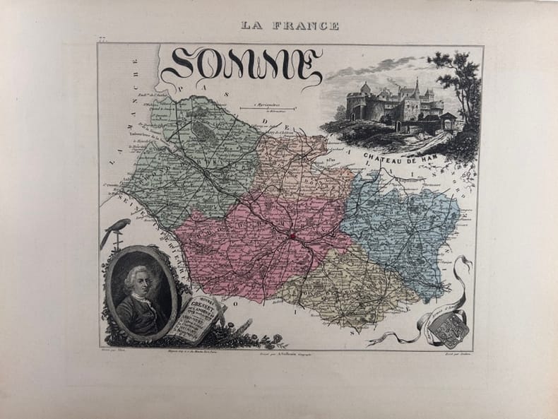 Paris J. Migeon, Libraire -Editeur, Carte ancienne de toute fraîcheur gravée sur acier, imprimée sur papier fort et accompagnée de sa notice historique, biographique, statistique, etc.. sur une feuille distincte. Format de la carte, marges comprises : 26x35cm.