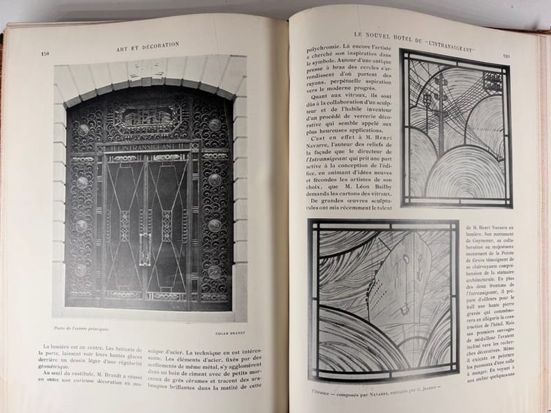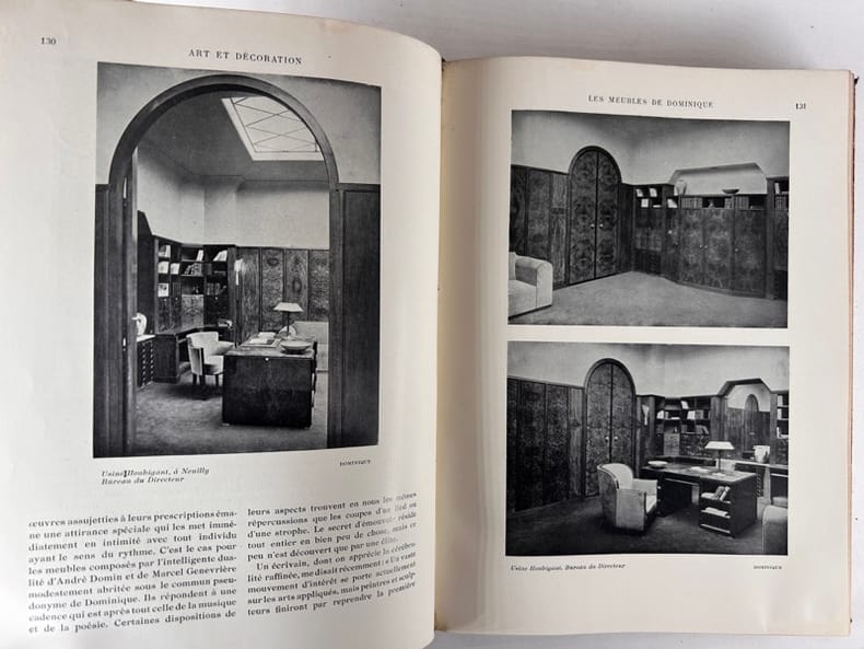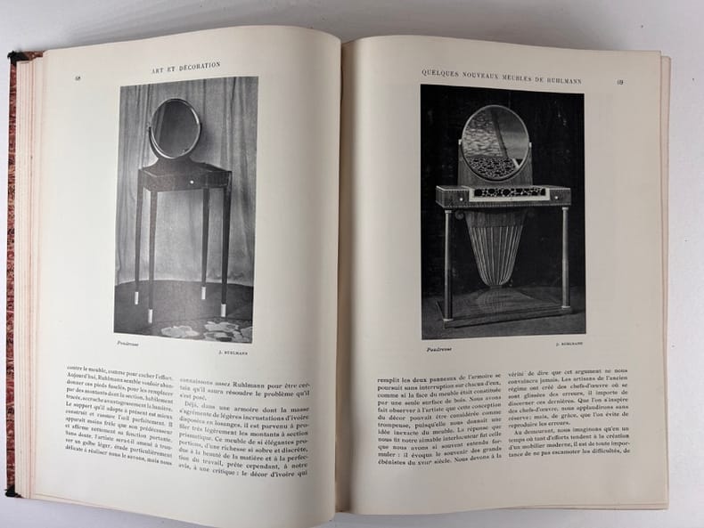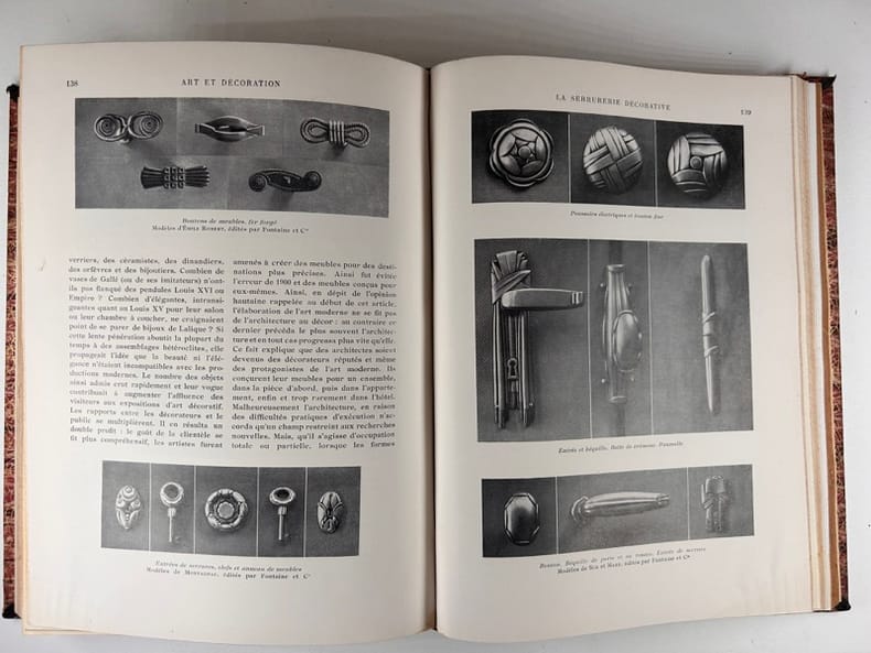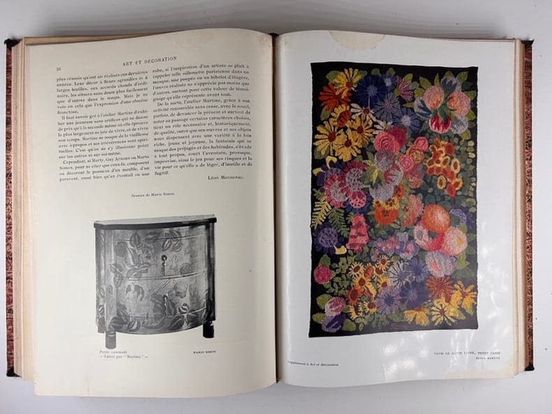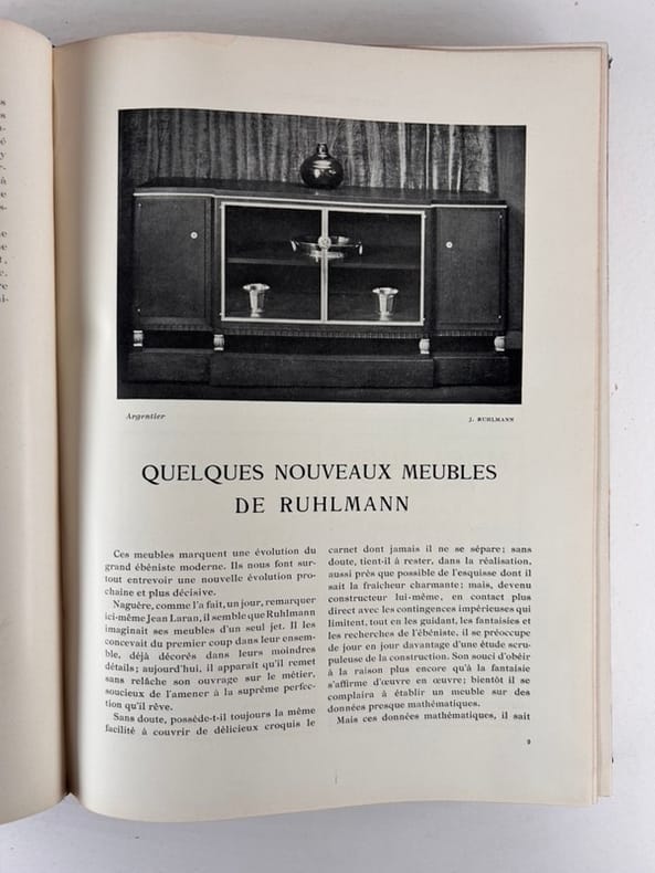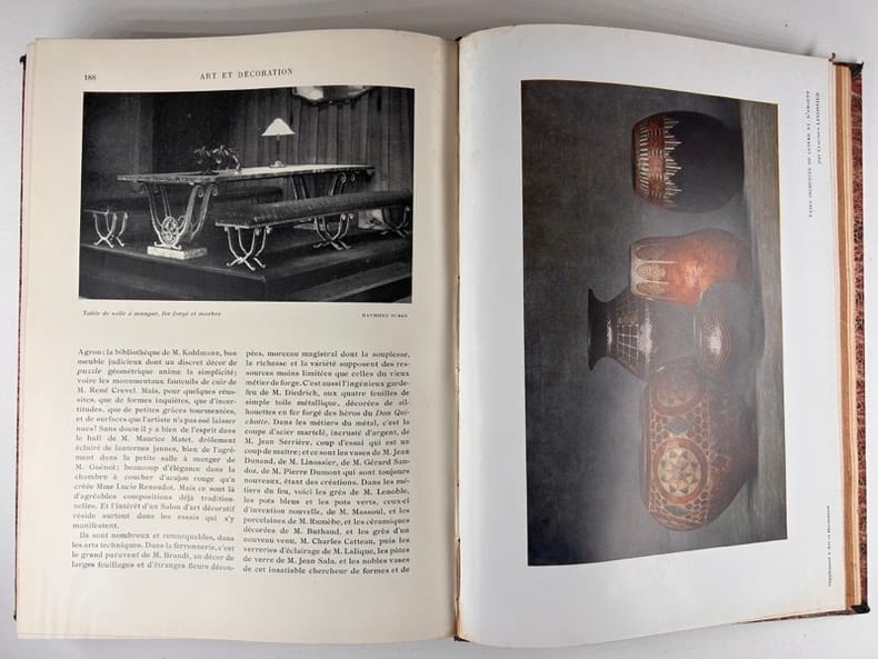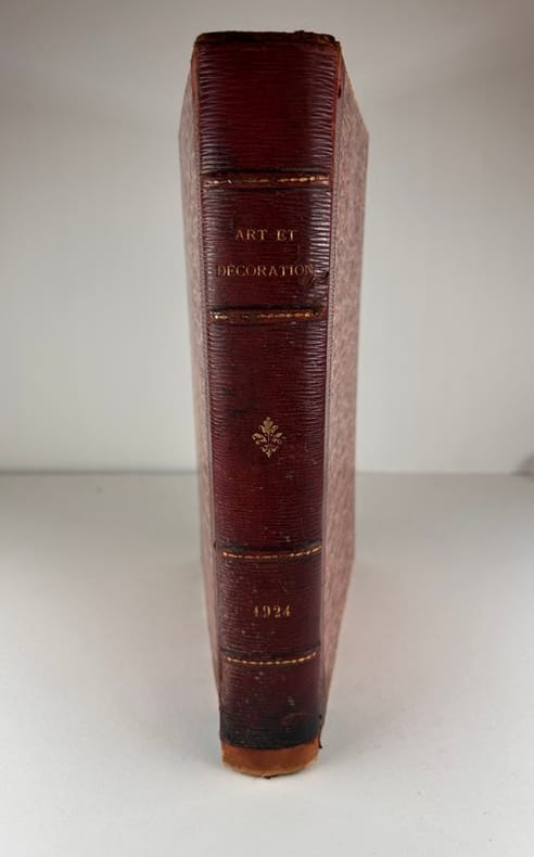 Paris Librairie Centrale des Beaux-Arts 1924, in-4 (20 x 29 cm), demi-reliure chagrin à grain long de l'époque, Manque de cuir au dos sur 1 cm . Quelques rousseurs et petites traces de mouillures en bas de page.Table des matières du tome XLV : La nouvelle Église du Raincy, par YVANHOË RAMBOSSON Masques de la Côte d'Ivoire, par H. CLOUZOT et A. LEVEL. Charles Rivaud, par GUSTAVE KAHN Joseph Bernard, par TRISTAN LECLERE La Manufacture de faïences de Copenhague, par GABRIEL MOUREY. Les Médailles de sport de L.-C. Mascaux, par CHARLES SAUNIER Les Céramiques d'Emile Decœur, par GUILLAUME JANNEAU Rik Wouters, par PAUL COLIN. L'Enseignement à l'Ecole Boulle, par REN CHAVANCE. Maisons de la Loire, par LEANDRE VAILLAT Quelques nouveaux meubles de Ruhlmann, par CHARLES-HENRY BESNARD Le 35 Salon des Indépendants, par ROBERT REY Les Peintures Tibétaines, par D' PIERRE ROUSSEAU Le nouvel Hôtel de Ville de Stockholm, par L. BORGEX Tissus et tapis de Bénédictus, par GASTON VARENNE. Daragnès, par RAYMOND ESCHOLIER L'Art décoratif contemporain au Pavillon de Marsan, par RENÉ CHAVANCE Wayangs Javanais, par M. P.-VERNEUIL. Les Meubles de Dominique, par YVANHOË RAMBOSSON Marcel-Lenoir, par JEAN-LOUIS VAUDOYER. L'Art décoratif moderne en Hollande: La Céramique, par HENRY ASSELIN Les Monuments Musulmans du Maroc, par GEORGES MARÇAIS Le XV Salon des Artistes décorateurs, par LÉON DESHAIRSTable des illustrateurs : ADLER (Rose) ALIX (Yves) BARBEY (Valdo) BÉAL (Georges) BÉNÉDICTUS BERNARD (J.) BOUCHARD (Henry) BOURDELLE (A.) BOURDON (R.) BRABO BRANDT (Edgar) CAPON (Eugène et Georges) CHAMBELLAN CHAREAU (Pierre) CLAIRIN (P.) COLENBRANDER (Th.) COLLET (Edouard-L.) DARAGN S DAUM (J.-A.) DAURAT (Maurice) DECCŒUR (Emile) DOMINIQUE DUFRÈNE (Maurice) DUNAND (Jean) Ecole Boulle ELDH (Carl) FABRE (Auguste-V.) Faïences de Copenhague. FILON (A.) FOLLOT (Paul) FORSETH FOURNIER (Gabriel) FRÉCHET (André) GABRIEL (René) GALLEREY (Mathieu) GAUDISSARD (E.) GOUPY (Marcel) GUILLEMARD (Marcel) HAIRON (Charles) HERBST (René) JALLOT (Léon-Albert) JOUBERT (René) KOHLMANN (Etienne) KROP (Hildo) LALIQUE (René) LANGRAND (Andrée) LANOOY (Chr.) LEGRAIN (Pierre) LELEU (J.-C.) LINOSSIER (Claudius) LINZELER (R.), éditeurTable des matières du tome XLVI : Les Meubles de René Joubert et Ph. Petit, par CHARLES SAUNIER Dunoyer de Segonzac, par CLAUDE ROGER-MARX. Fédor Schmetz, par L. FLORENTIN Les Salons des Champs-Élysées, par ROBERT REY L'Atelier Martine, par LÉON MOUSSINAC Le Salon des Tuileries, par ROBERT REY Joseph Hoffmann et L'Atelier Viennois", par LEOPOLD KLEINER Les Tapis de Da Silva Bruhns, par MARCEL WEBER Un Peintre de l'Ombrie et de la Provence: André Strauss, par CAMILLE MAUCLAIR Léon Jallot, par RENÉ CHAVANCE Jane Poupelet, par H. MARTINIE Émile Lenoble, par LÉON DESHAIRS Un sculpteur de pierres dures: Matèo Hernandez, par RENÉ-JEAN Georges Renouvin, par GUILLAUME JANNEAU Maillol, par ROBERT REY La Serrurerie décorative, par H. MARTINIE Les Paysages de Laure Bruni, par L. FLORENTIN Raymond Subes, ferronnier, par ADOLPHE DERVAUX La Ferronnerie et les Vitraux du nouvel Hôtel de "l'Intransigeant", par RENÉ CHAN La Peinture et la Sculpture au Salon d'Automne, par JEAN-LOUIS VAUDOYER L'Art urbain et l'Art décoratif au Salon d'Automne, par GUILLAUME JANNEAU.Table des illustrateurs : ANDRE (Albert) ARNOLD (Henri) ASSELIN (Maurice) BARAT-LEVRAUX (G.) BIDDLE (Georges) BIGONET BILLOTEY BOURAINE (Marcel) BRABO (Albert) BRANDT (Edgar) BRUNI (Laure) BURKHALTER (Jean) CARREAU (FENZY et) CERIA (Edouard) CHAREAU (Pierre) CHMETZ (Fédor) CORMIER (Fernande) DA SILVA BRUHNS DAVID (Hermine) DESPIAU (Ch.) DONGEN (VAN) DUFRÈNOY (G.) DUFRESNE (Ch) DUNOYER DE SEGONZAC DUPAS (Jean) FABRE (Aug.) FAU et GUILLARD FAVIER FAVORY (A.) FENZY et CARREAU FLANDRIN (Jules) FRIESZ (Othon) GAUTIER (René-Georges) GIGOU (Louis) GIMMI (W.) GIMOND (Marcel) GIRIEUD (Pierre) GUILLARD (FAU et) GUILLEMARD (Marcel) HANNAUX (Paul) HENRI-MATISSE HERBST (René) HERNANDEZ (Matéo) HOFFMANN (Joseph) INGUIMBERTY JALLOT (Léon) JEANNIN (G.) JOUBERT et PETIT JOURDAIN (Francis) LAMBERT (Théodore) LE MAISTRE (Yvanna) LE MÊME LENOBLE (Émile) LEVARD (Alfred) LINOSSIER LOYAU (Marcel) MAILLOL (A) MAINSSIEUX (L) MALLET-STEVENS (Rob.) MARE (SUE et) MARQUE (A.) MARQUET (A.) MARTINE (Atelier) MATET (Maurice) MONTAGNAC MOREUX (Jean-Charles) NATHAN (F.) NAVARRE NICLAUSSE (Paul) ORLOFF (Chana) PETIT (JOUBERT et Ph.) PETIT (Ph.) POMPON (François) PONCIN (A.) POPINEAU POUPELET (Jane) PRINET (R.-X.) PROU (Ren ) RENAUD (Francis) RENAUDOT (Lucie) RENOUVIN (G.) RIOU (L.) ROBERT (Émile) SABBAGH (G.-H.) SAUPIQUE (Georges) SEGONZAC (DUNOYER de) SIMON (Mario) STRAUSS (André) SUBES (Raymond) SUE et MARE SUR DA (André) VAN DONGEN V RA (Paul) VLAMINCK (Maurice de) WAROQUIER (Henry de) YUNG (Pierre) ZINGG (J.-E.)