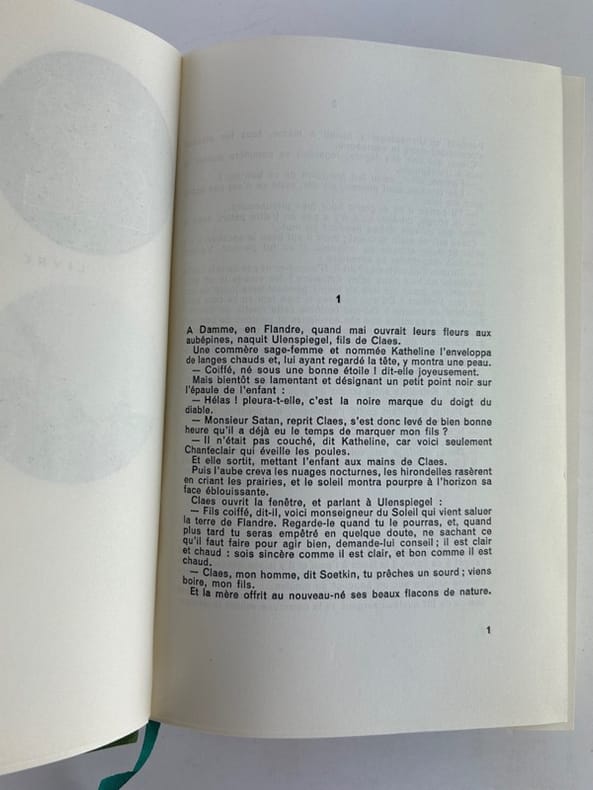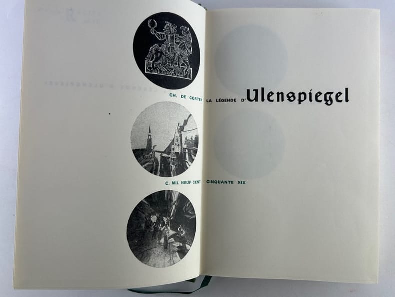 Reims, Éditions Hébé, MCMXLVII [1947], 1 emboîtage contenant 2 chemises rigides renfermant 2 tomes en cahiers non-reliés de 2 db-f. enchassés, sous chemises souples, titrées. Ensemble de l'éditeur. Grand in-4° (33,2 x 25,9 cm). Tome I : 1 cahier de faux-titre, justification et titre, p. 9-207 dont 10 pointes sèches, 1 cahier d'achevé d'imprimer. Tome II : 1 cahier de faux-titre, justification et titre, p. 9-229 dont 10 pointes sèches, 1 db-f. d'achevé d'imprimer. Texte en français, imprimé en deux couleurs : noir et rouge, illustré de 20 gravures originales pleine-page in-texte. Édition magnifiquement illustrée de ce récit du voyage initiatique de Thijl Ulenspiegel dans les Flandres au XVIème siècle, dans le contexte de l'inquisition religieuse menée par le pouvoir espagnol. Charles de Coster écrit cette légende en 1847, s'inspirant d'un personnage du folklore flamand. Charles de Coster (1827-1879) : auteur, historien et homme politique par ailleurs. Nicolas Eekman (1889-1973) : peintre et graveur, d'origine belge, installé à Paris à partir de 1921. ISNI 0000 0001 0851 301X.