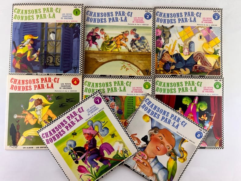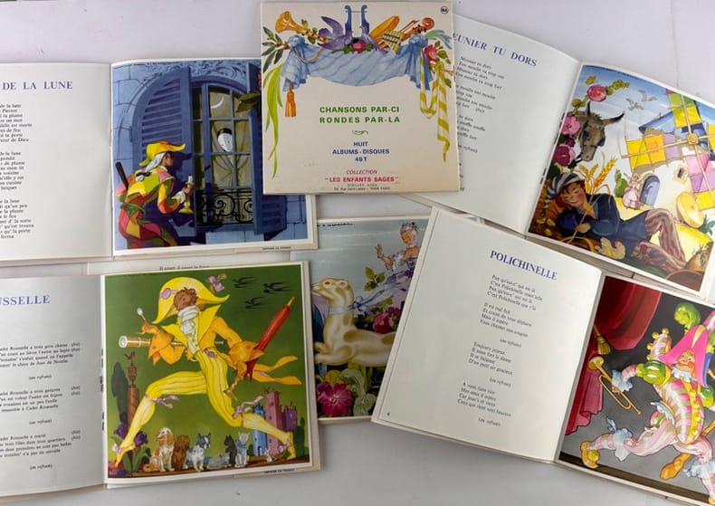 Paris Spadem/ Coll. les Enfants Sages 1971, 18,5x18,5cm, Etat de quasi-neuf pour l'ensemble. Microsillons en parfait état. Environs 7 illustrations originales par Mercier pour chaque disque. Titres des chansons : AH! MON BEAU CHATEAU DAME TARTINE C'EST L'VENT FRIVOLANT IL ETAIT UNE BERGERE AU CLAIR DE LA LUNE EN PASSANT PAR LA LORRAINE AINSI FONT, FONT, FONT SUR LE PONT D'AVIGNON FAIS DODO, COLAS, MON P'TIT FRÈRE NOUS N'IRONS PLUS AU BOIS LE ROI DAGOBERT MAMAN LES P'TITS BATEAUX MEUNIER, TU DORS GENTIL COQUELICOT IL ETAIT UN PETIT NAVIRE SAVEZ-VOUS PLANTER LES CHOUX MONSIEUR DUMOLLET CADET ROUSSELLE LE CHEVALIER DU GUET ARLEQUIN ET POLICHINELLE LA BONNE AVENTURE LE PETIT MARI LA MERE MICHEL AUPRES DE MA BLONDE LE FURET DU BOIS JOLI MALBROUGH POLICHINELLE LA BOULANGERE A DES ECUS ALOUETTE C'ETAIT UN ROI DE SARDAIGNE COMPERE GUILLERI LA TOUR, PRENDS GARDE LE PETIT CHASSEUR A LA CLAIRE FONTAINE QUAND J'ETAIS CHEZ MON PERE FRERE JACQUES IL PLEUT BERGERE JOLI TAMBOUR J'AI DU BON TABAC AH! VOUS DIRAIS-JE, MAMAN DANSONS LA CAPUCINE ET MOI DE M'EN COURIR