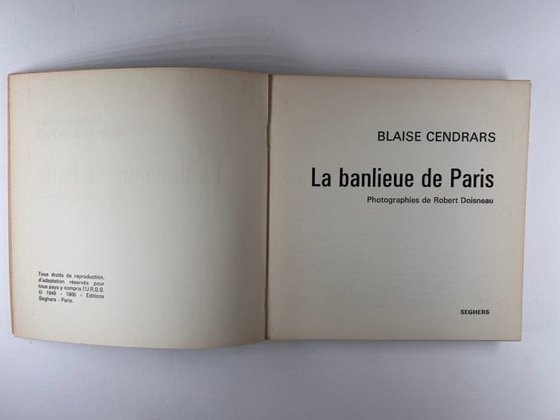 Editions Pierre Seghers, publié en collaboration avec la Guilde du Livre de Lausanne 1949. In-8 cartonnage éditeur, crème, de 195 pages au format 24 x 18 cm. Couverture avec titre imprimé. Dos rond avec titre. Pages de garde illustrées. Complet de la rarissime jaquette photographique, avec renforcements au verso et frottis aux bords. La jaquette est un peu plus petite que livre qui lui, est en état proche du parfait. Texte inédit de Blaise Cendrars sur 55 pages, présentant la banlieue de Paris après la seconde guerre mondiale, suivi de 130 photographies en noir de Robert Doisneau, tirées en héliogravure. Rare édition originale du premier livre de Robert Doisneau, publiée par Pierre Seghers en collaboration avec la guilde du livre de Lausanne. L’éditeur parisien disposa de 3000 exemplaires sur les 7000 qui furent mis en vente le 15 octobre 1949, il les dota, pour le marché français, d’une page de titre et surtout d’une belle jaquette illustrée . On joint le prière d'insérer de la réétion Denoël de 1983.