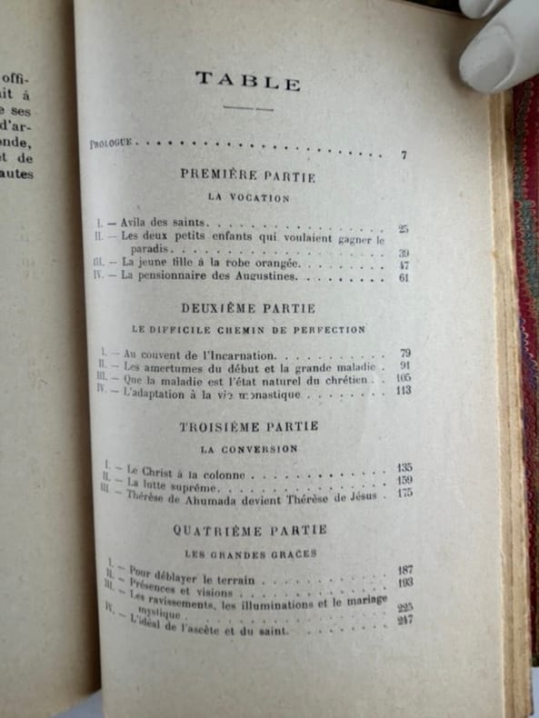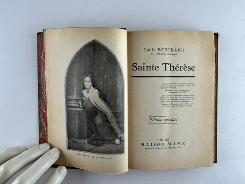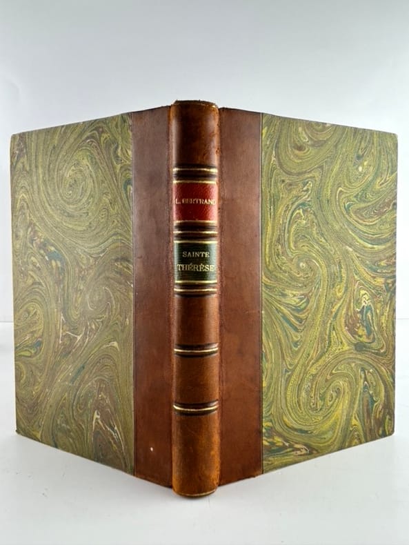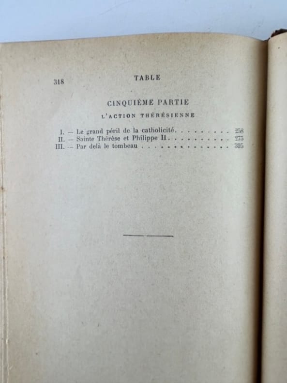 Un volume grand in-8 (17, 5 x 24 cm), broché, couverture souple éditeur à rabats, 1er plat illustré d’un plan de couleur jaune avec un trait rouge unissant tous les Carmels fondés en Espagne par Sainte THÉRESE D’AVILA . 218 pages dont une Table des matières suivies de 57 photographies en noir. Thérese d’AVILA (1515-1582), qui fut canonisée 40 ans après sa mort, a laissé des écrits sur son expérience spirituelle qui font d’elle une des figures majeures de la littérature mystique. Elle est également connue pour avoir fondé 17 couvents de Carmélites, dans lesquels ces dernières vivaient absolument retranchées du monde et dans un silence total.Notre exemplaire, devenu peu fréquent, présente de très discrètes traces de manipulation sur la couverture, mais est totalement intact à l’intérieur. ETAT TRES SATISFAISANT.