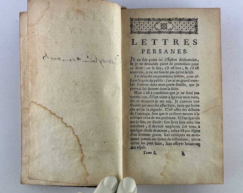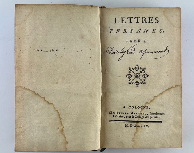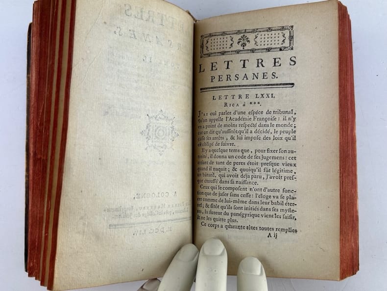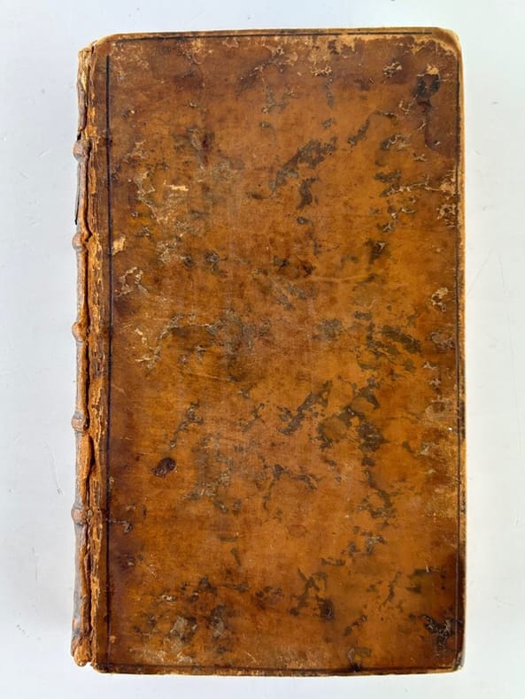 Cologne, Chez Pierre Marteau 1744, 165x100mm, 172 + 196 + 69pages, reliure veau de l’époque, dos à nerfs, pièce de titre et fleurons dorés, charnière droit fendue, tache sur le plat supérieur. Notes manuscrites sur page de garde, e.a. “acheté à Marseille chez le libraire Tauvel au cours ce 10 février 1760 David Bridel Minis.”