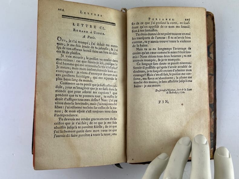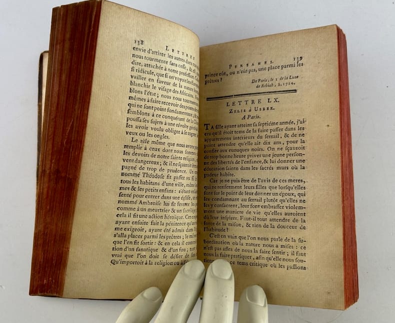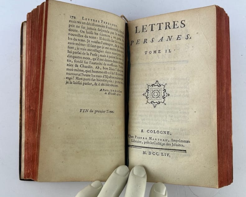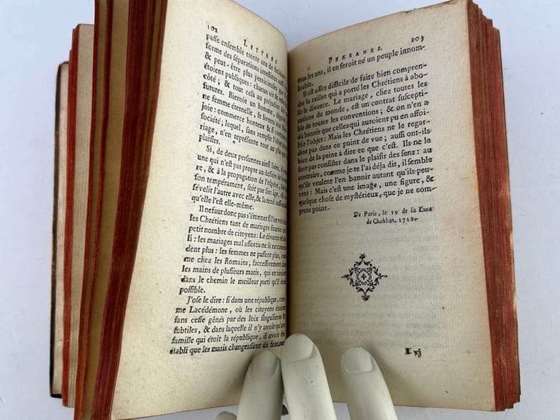 Cologne, Chez Pierre Marteau 1743, 163x95mm, 191 + 215pages, plein veau de l’époque, dos à nerfs, pièce de titre, fleurons dorés, tranches jaspées, usures aux coins, autrement bon état.