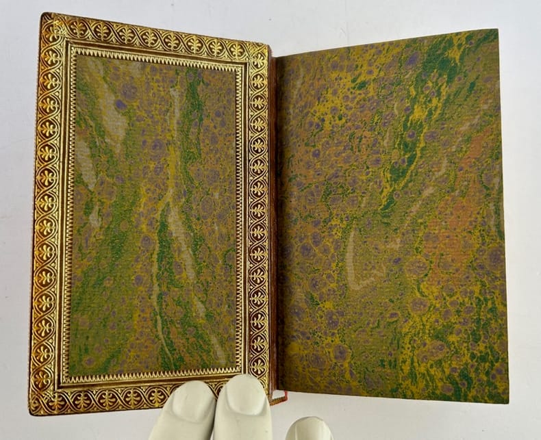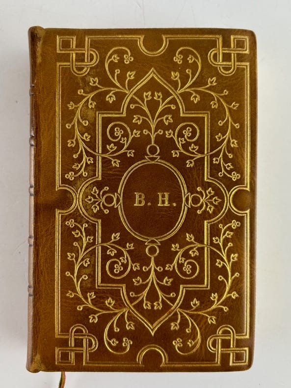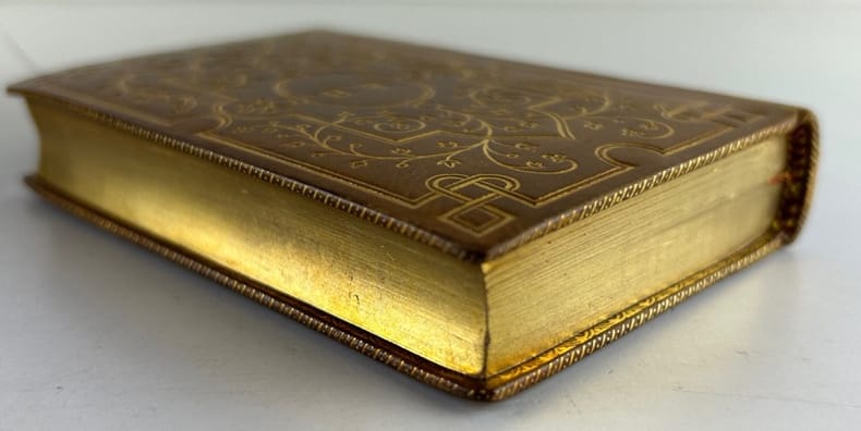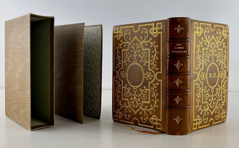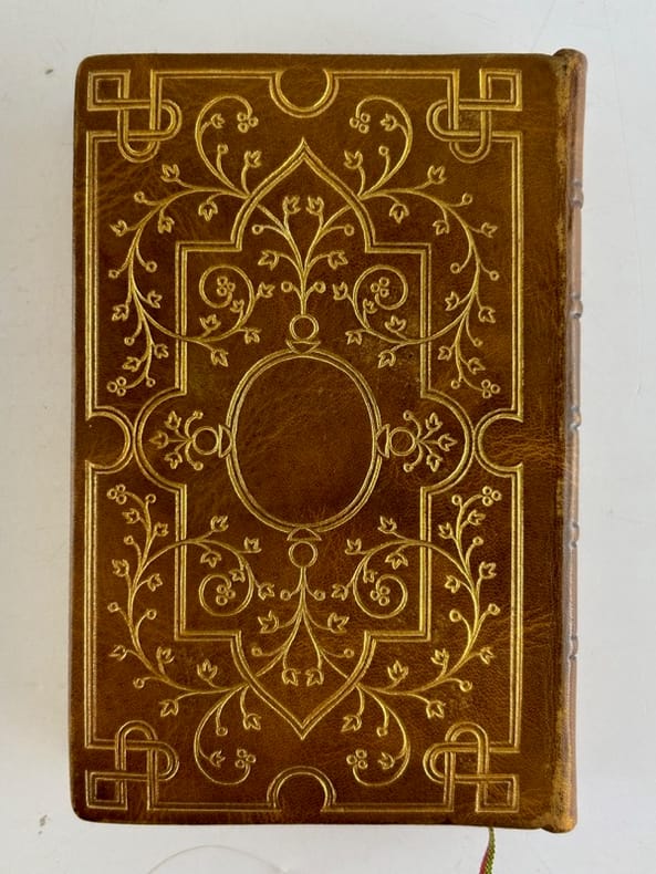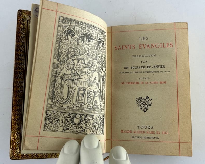 Tours Maison Alfred Mame et Fils 1911, 9x12cm, pleine reliure ornée d'une plaque à la fanfare, roulette sur chasses et sur chants, toutes tranches dorées, sous double emboîtage, 482p. Parfait état.