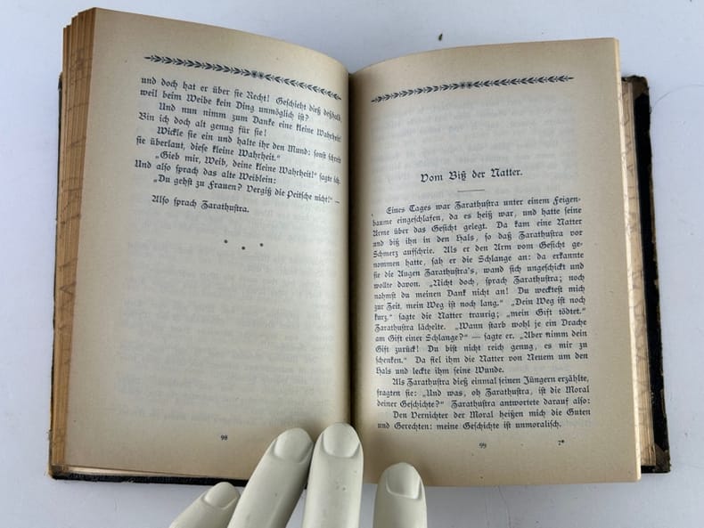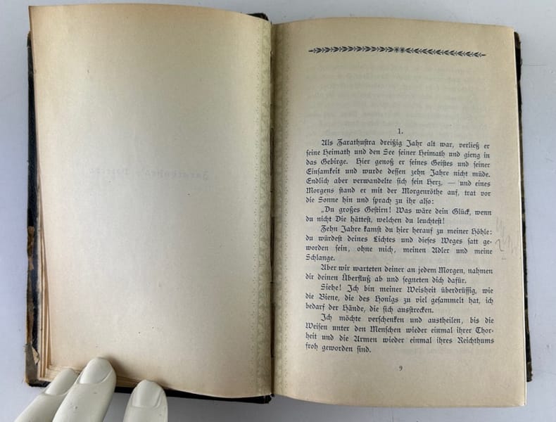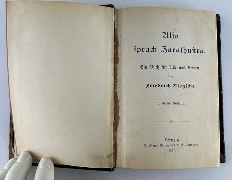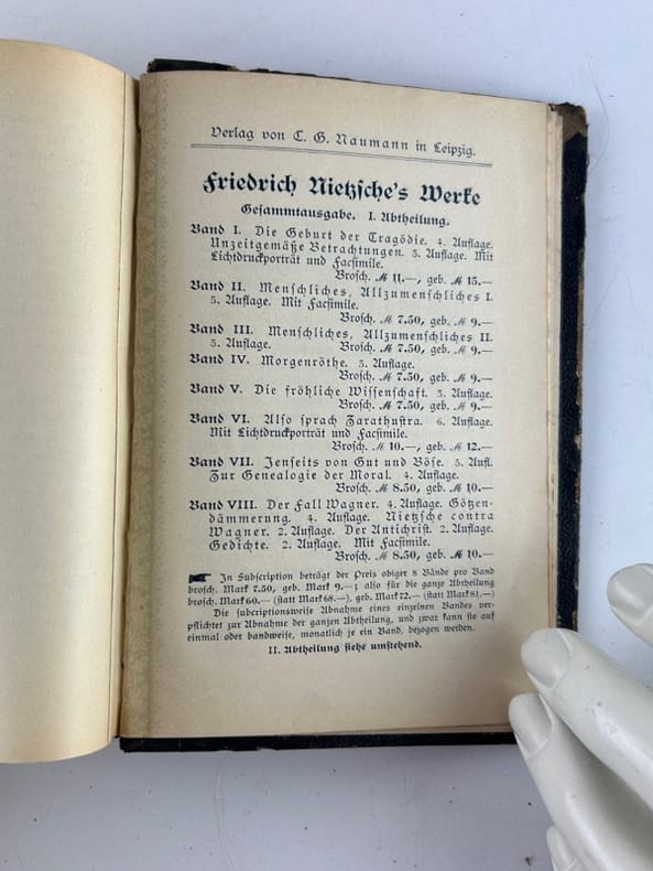 Leipzig Druck und Verlag von C.G. Naumann 1897, 10,5 x 15,5 cm, demi-reliure, dos long, titre en creux, plats de percaline noire, 479p. Friedrich Nietzsche's werke in fine (12 Seiten). In gutem Zustand. Bon état.