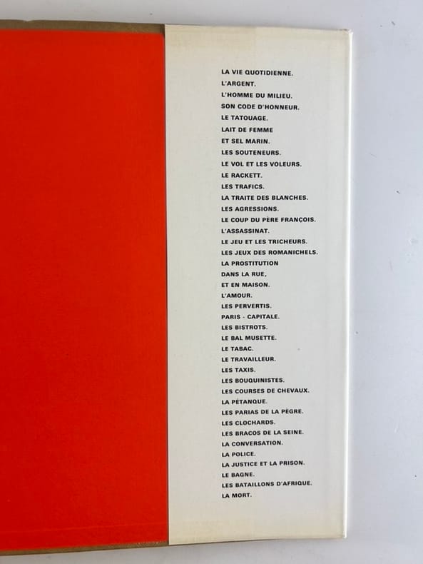 LA VIE QUOTIDIENNE. L'ARGENT. L'HOMME DU MILIEU. SON CODE D'HONNEUR. LE TATOUAGE. LAIT DE FEMME ET SEL MARIN. LES SOUTENEURS. LE VOL ET LES VOLEURS. LE RACKETT. LES TRAFICS. LA TRAITE DES BLANCHES. LES AGRESSIONS. LE COUP DU PÈRE FRANÇOIS. L'ASSASSINAT. LE JEU ET LES TRICHEURS. LES JEUX DES ROMANICHELS. LA PROSTITUTION DANS LA RUE ET EN MA S . L'AMOUR. LES PERVERTIS. PARIS CAPITALE. LES BISTROTS. LE BAL MUSETTE. LE TABAC. LE TRAVAILLEUR. LES TAXIS. LES BOUQUINISTES. LES COURSES DE CHEVAUX. LA PÉTANQUE. LES PARIAS DE LA PEGRE. LES CLOCHARDS. LES BRACOS DE LA SEINE. LA CONVERSATION. LA POLICE. LA JUSTICE ET LA PRISON. LE BAGNE. LES BATAILLONS D'AFRIQUE. LA MORT.