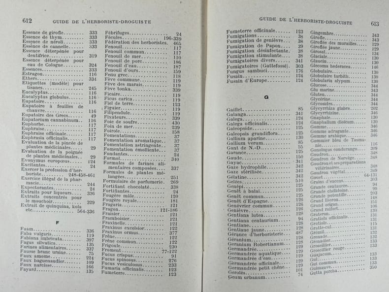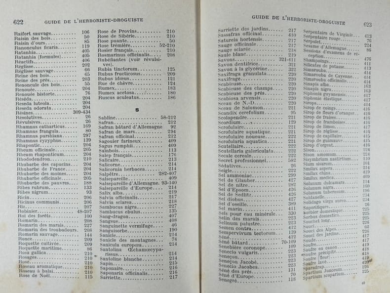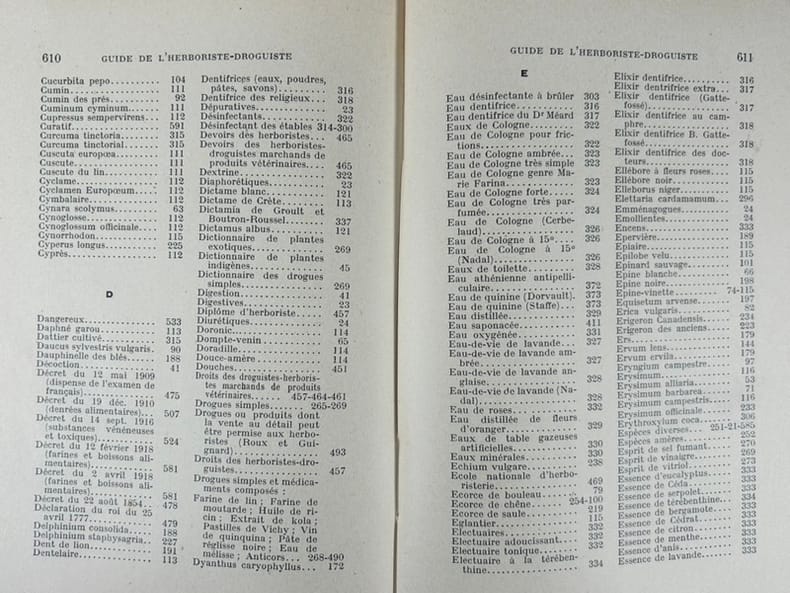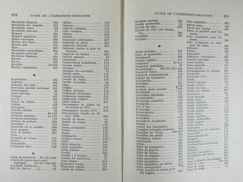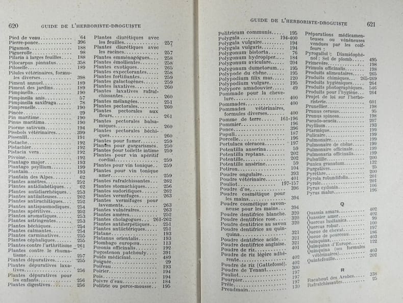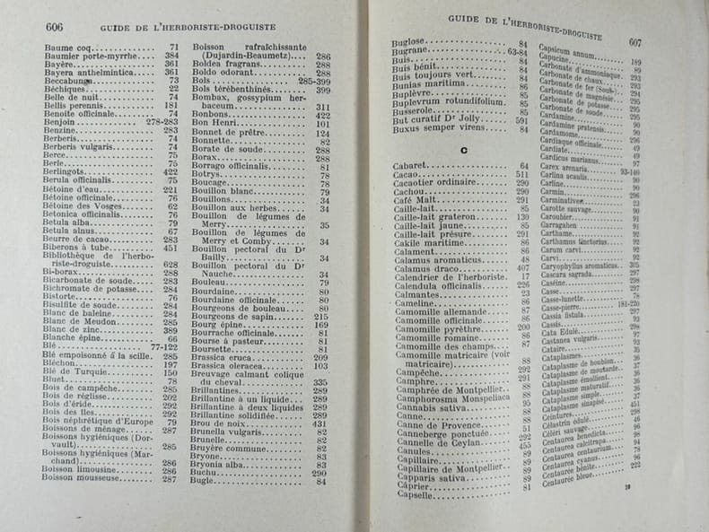 Aperçu de l'index : Abies pectinata. Abréviations employées dans l'ouvrage.. Absinthe maritime. Absinthe officinale ... Absinthe petite. Absinthe Suisse.. Acacia. Acacia catechu. Acacie. Acanthe (acanthus mollis). Accessoires. Acétone. Ache officinale. Ache persil. Achillea millefolium. Achillea ptarmica. Acides.. Acide acétique. Acide borique.. Acide carbolique... Acide chlorhydrique. Acide citrique... Acide crésilique .. Acide pyrogallique. Acide de citron. Acide du sucre. Acide muriatique. Acide salicylique. Acide lactique.. Acide oxalique. Acide phénique. Acide salicylique et formu-les. Acide sulfurique. Acide tannique. Acide thymique. Acide thymique et formules. Acide tartrique.Acore vraie...... Acorus calamus. Adiantum capillus veneris. Adonis vernalis.. Adoucissantes... ..... Adoxamoscatellina Esculus hippocastanum... Æthusa meum.. Agar-agar. Agaric amadouvier. Agaric de chêne... Agrimoine... Agrimonia eupatoria. Agripaume.. Aiglantine columbine. Aigrelier.. Aigremoine. Aigrette.... Ail (allium sativum). Airelle myrtille. Airelle rouge.... Ajonc. Ajuga reptens. Alaterne..... Alcali volatil. Alcea rosea... Alcée.... Alchemilla vulgaris. Alchimille. Alcool.. Alcool de menthe. Alcool de vinaigre... fumi- Alcool pour lampes à gations antiseptiques. Alcoolé (alcool mouillage). Alcoolé de citron... Alcoolé de vanille. Aldehyde formique. Algue commune. Alhenna. Aliboufier. Alisier.. Alkékenge. Alleluia. Alliaire.. Allinum Porrum. Allium cepa..... Aloès.. Aloès vulgaris. Althea officinalis. Alun.. Amadou.. Amadou des chirurgie Amande amère ... Amandier. Ambroisie. Ambroisie du Mexique Ambre gris.. Amères.. Amidon. Ammi... Ammi majus. Ammoniaque.... Amygdalis communis. Amygdalis persica.... Analeptiques....... Anchusce officinale.. Ancolie... Andropogon muricatus Anémone Sylvie...... Anémone des bois. Anemone nemorosa. Anemone pulsatilla... Anesthésie locale Dr Lét Aneth........ Aneth odorant....... Anethum fœniculum.. Anethum graveolens... Angelica archangelica.. Angélique. Angélique officinale. Anis. Anis étoilé. Anis vert.. Ansérine.. Ansérine anthelmintiqu Ansérine botrys.. Ansérine vermifuge. Anthémis nobilis... Anthemis pyrethrum. Anthyllide vulnéraire. Anthyllis vulneraria... Antiaphrodisiaques. Anticonceptionnels. Antidéperditrices... Antirrhinum cymbalari Alleluia. Alliaire.. Allinum Porrum. Allium cepa..... Aloès.. Aloès vulgaris. Althea officinalis. Alun.. Amadou.. Amadou des chirurgie Amande amère ... Amandier. Ambroisie. Ambroisie du Mexique Ambre gris.. Amères.. Amidon. Ammi... Ammi majus. Ammoniaque.... Amygdalis communis. Amygdalis persica.... Analeptiques....... Anchusce officinale.. Ancolie... Andropogon muricatus Anémone Sylvie...... Anémone des bois. Anemone nemorosa. Anemone pulsatilla... Anesthésie locale Dr Lét Aneth........ Aneth odorant....... Anethum fœniculum.. Anethum graveolens... Angelica archangelica.. Angélique. Angélique officinale. Anis. Anis étoilé. Anis vert.. Ansérine.. Ansérine anthelmintiqu Ansérine botrys.. Ansérine vermifuge. Anthémis nobilis... Anthemis pyrethrum. Anthyllide vulnéraire. Anthyllis vulneraria... Antiaphrodisiaques. Anticonceptionnels. Antidéperditrices... Antirrhinum cymbalari ORIS Asclepiade ... Asclepias vincetoxicum. Ase fétide....... Asparagus officinalis.. Asperge..... Asperula odorata. Aspérule odorante.. Asplenium ceterach. Assa fœtida.. Astragale... Astragalus glycyphyllos.. Astringentes. Aubépine... Aulne.. Aune commun. Aunée.... Aunée officinale. Aurone... Aurone femelle. Aurone mâle. Avena sativa. Avoine.... Avortement. Azaret. Azotate de potasse. B Badiane. Baguenaudier. Bains. Bain alcalin. Bain aromatique. Bain de pieds à la mou tarde.. Bain de savon. Bain de son. Bain de tilleul. Bain de valériane. Bain émollient. Bain fortifiant. Bain tonique à la bruyère Ballota nigra. Ballote noire.. Balsamiques... Balsamite odorante. Bandages. Barbarée. Bardane officinale. Bas pour varices. Basilic officinal... Bâtons russes aromatiques Boisson (Dujardin-Beaumetz).... rafraîchissante Boldea fragrans.. Boldo odorant. Bols Bols térébenthinés. 28 Bombax, gossypium her-baceum. Bonbons. Bon Henri. Bonnet de prêtre. Bonnette.. Borate de soude. Borax. Borrago officinalis. Botrys. Boucage. Bouillon blanc.. Bouillons.. Bouillon aux herbes. Bouillon de légumes de Merry.. Bouillon de légumes de Merry et Comby. Bouillon pectoral du Dr Bailly. Bouillon pectoral du Dr Nauche... Bouleau... Bourdaine.. Bourdaine officinale. Bourgeons de bouleau. Bourgeons de sapin. Bourg épine... Bourrache officinale. Bourse à pasteur.. Boursette.. Brassica eruca Brassica oleracea. Breuvage calmant colique du cheval.. Brillantines.. Brillantine à un liquide Brillantine à deux liquides Brillantine solidifiée. Brou de noix. Brunella vulgaris. Brunelle... Bruyère commune. Bryone. Bryonia alba... Buchu.. Bugle. Buglose. Bugrane. Buis. Buis bénit. Buis toujours vert. Bunias maritima. Buplèvre.. Buplevrum rotundifolium. Busserole... But curatif Dr Jolly. Buxus semper virens. C Cabaret. Cacao... Cacaotier ordinaire. Cachou. Café Malt. Caille-lait.. Caille-lait grateron. Caille-lait jaune... Caille-lait présure. Cacile maritime. Cadument... Calamus aromaticus. Calamus draco... Calendrier de l'herboriste. Calendula officinalis. Calmantes. Cameline.. Camomille allemande. Camomille officinale. Camomille pyrèthre. Camomille romaine. Camomille des champs. Camomille matricaire (voir matricaire). Campêche. Camphre. Camphrée de Montpellier.. Camphorosma Monspeliaca Cannabis sativa.... Canne. Canne de Provence. Canneberge ponctuée. Cannelle de Ceylan.. Canules. Capillaire. Capillaire de Montpellier.. Capparis sativa.. Câprier.. Capselle. Capsicum annum... Capucine... Carbonate d'ammoniaque Carbonate de chaux..... Carbonate de fer (Sous-). Carbonate de magnésie.. Carbonate de potasse... Carbonate de soude... Cardamine... Cardamine pratensis. Cardamome... Cardiaque officinale.. Cardiate......