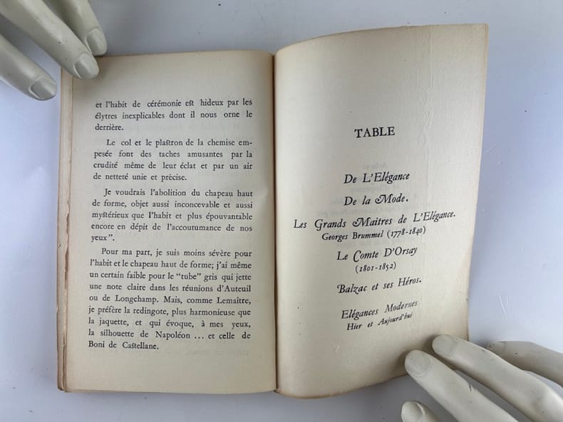 Table : De L'Elégance De la Mode. Les Grands Maitres de L'Elégance. Georges Brummel (1778-1840). Le Comte D'Orsay (1801- 1852) Balzac et ses Héros. Elégances Modernes Hier et Aujourd'hui. NB. La librairie sera fermée jusqu'à fin janvier. Les questions et commandes seront traitées dans les 48h, les envois reprendront le 2 février. Merci !