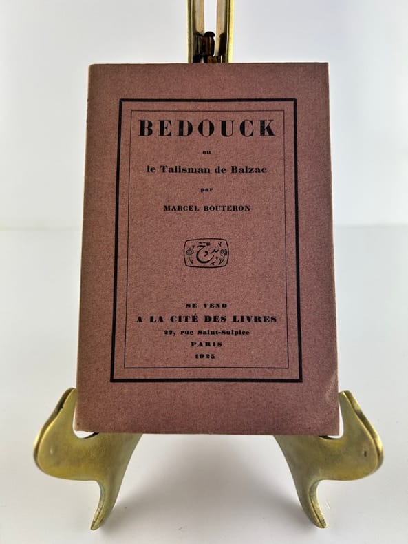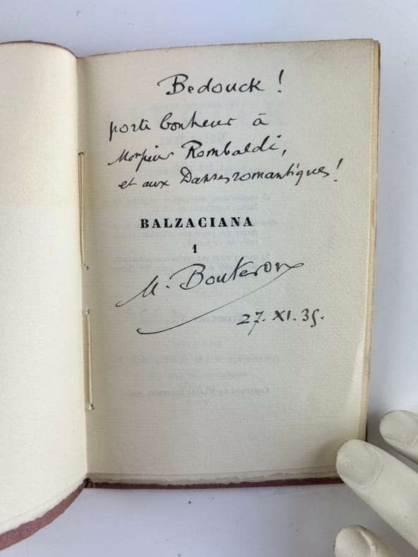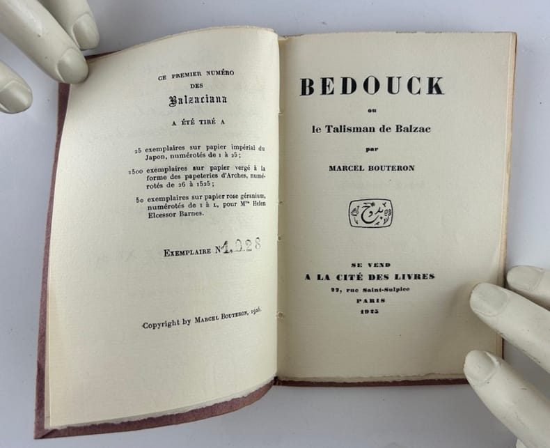 Edition originale de ce premier numéro de la collection des « Balzaciana ».1 des 25 exemplaires numérotés sur papier impérial du Japon, avec envoi autographe : "Pour la bibliothèque tsarienne de Monsieur Faure-Dujarric. Marcel Bouteron". Marcel Bouteron (1877-1962), directeur de la bibliothèque de l'Institut et éditeur des œuvres de Balzac de 1935 à 1937, relate ici l’histoire anecdotique du « Bedouck », une bague-talisman arabe offerte à Balzac.