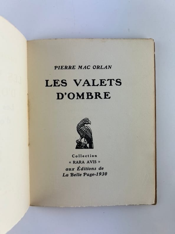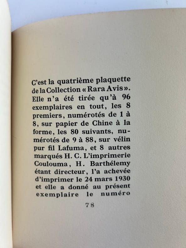 Paris Editions de la Belle Page/ Imp Coulouma/ H.Barthélémy dir. 1930, 13x16cm, broché, 22p. Exemplaire signé. Edition originale. Collection "Rara Avis". Tirage à 96 exemplaires. Un des 80 ex. sur vélin pur fil après 8 ex. sur Chine et 8 ex. hors commerce.