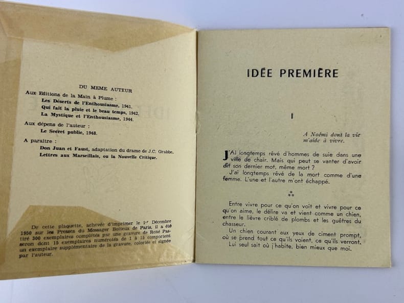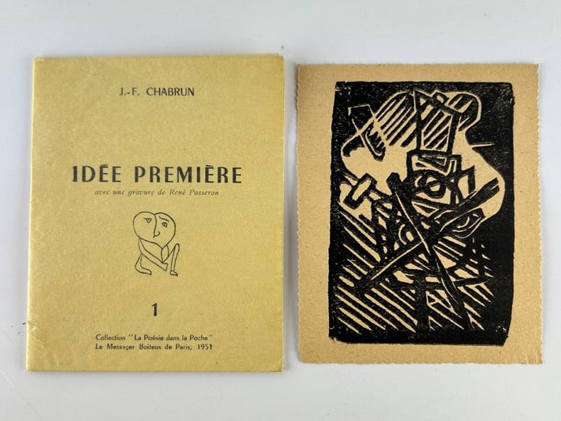 Paris : Le Messager boiteux (coll. "La poésie dans la poche", N°1), décembre 1950 - un volume 10,7x13,5 cm agrafé, (16) pages agrafées sous couverture illustrée - Edition originale tirée à 300 exemplaires enrichis d'une gravure sur bois de René Passeron - bon état -