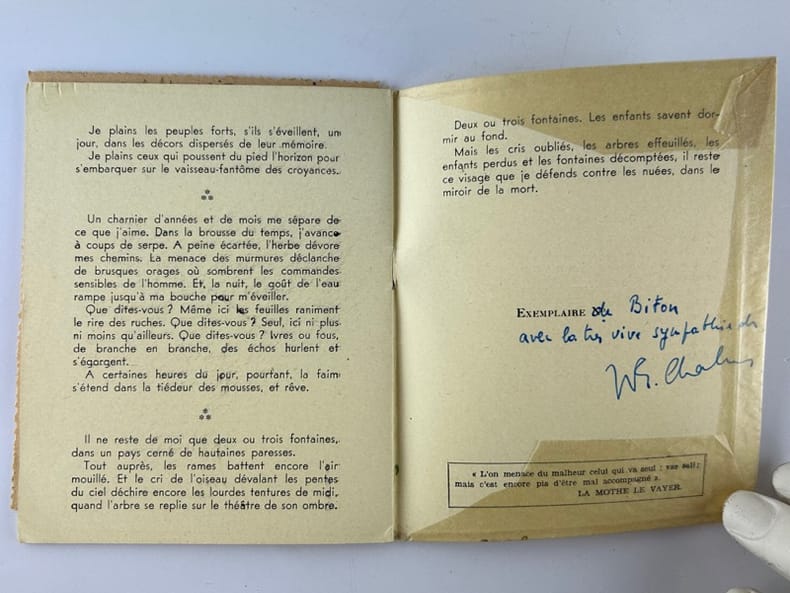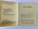 Paris Le Messager Boiteux de Paris, Collection La Poésie dans la Poche 1950, 11 x 13 cm, agrafé, np. Edition originale, tirée à 300 ex., bien complète de la gravure de René PASSERON et signée sur la dernière page par J.F. Chabrun. Hormis une légère pliure sur la couverture, bon état.