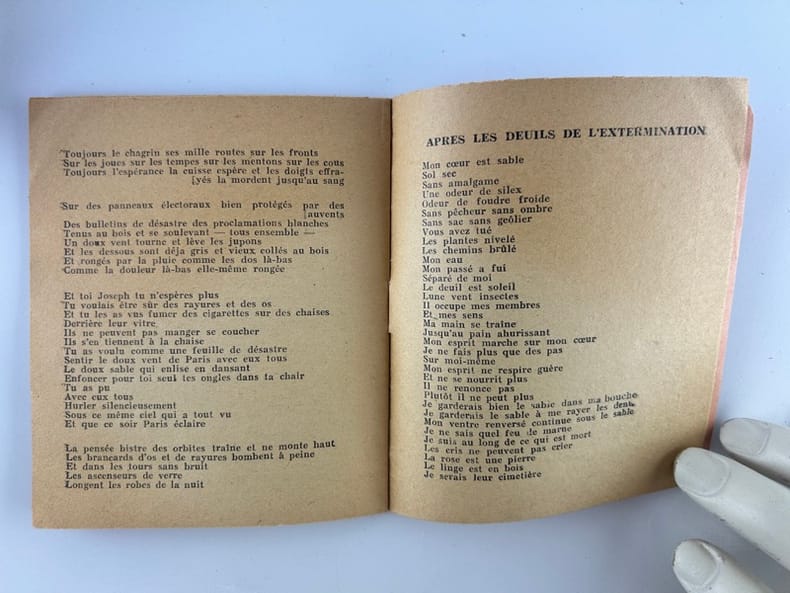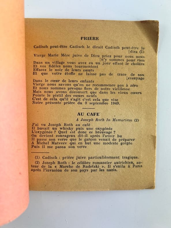 St-Girons Au Colporteur 1951, in-16, agrafé, non paginé (16p.) Edition originale. Hommage poétique aux victimes de la Shoah. Fragile plaquette. Couverture partiellement insolée.