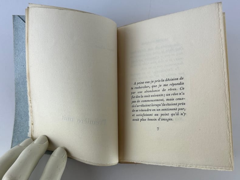 Paris, Camille Bloch, 1921, in-16, demi-maroquin turquoise à encadrements, plats de papier marbré, dos à 5 nerfs, couverture et dos conservés, non rogné, tête dorée, (Leroux), 81 p. Édition originale. 1/500 exemplaires numérotés sur vergé d'Arches à la forme. Jolie reliure ancienne de Georges Leroux.