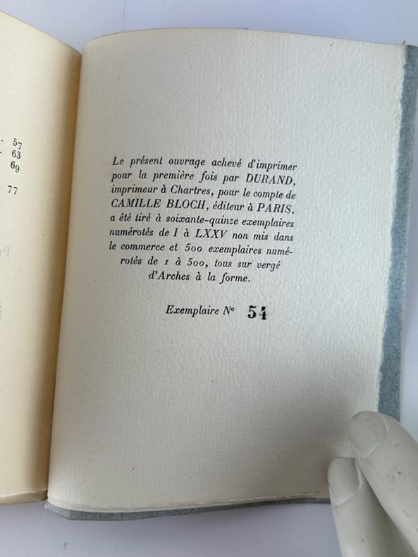 Paris Camille Bloch, Editeur 1921, in-12 (11 x 14cm), broché, 81p. Un des 500 ex. numérotés sur vergé d'Arches à la forme, après 75 ex. non mis dans le commerce. Ouvrage illustré d'une vignette de Raoul Dufy sur la couverture et la page de titre. Bon état.