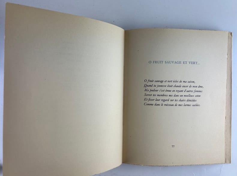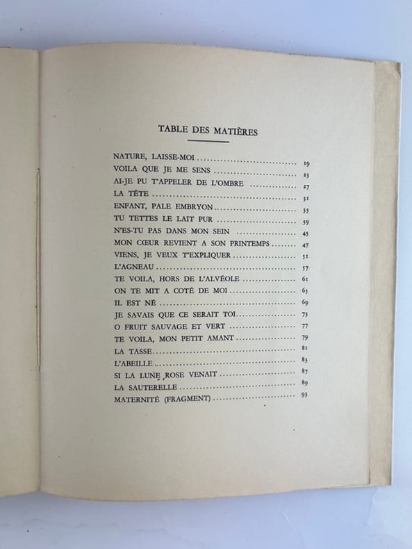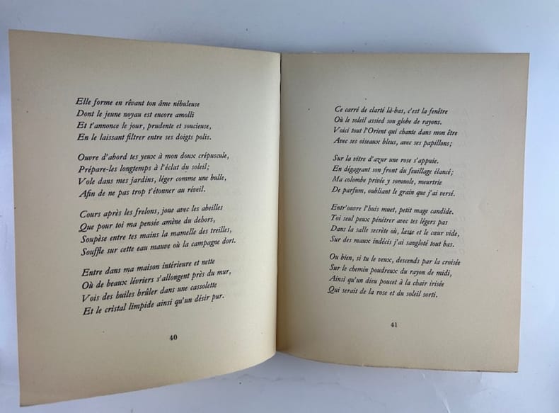 Paris Editions Steff 1955, 19 x 24 cm, broché sous couverture rempliée, 96p. Edition originale de ce recueil de poèmes de la mère d'Alain et Olivier Messaien. Un des 20 exemplaires réservés aux différents collaborateurs de ce volume (Mme Madeleine Lacassin) avec envoi de l'éditeur; suivent 50 ex. sur vélin HC imprimés aux noms des bénéficiaires et 50 ex. sur vélin numérotés de 1 à 400. Avec un portrait par Georges Pavis. Complet du bandeau reprenant l'éloge de Paul Léautaud. Bon état.