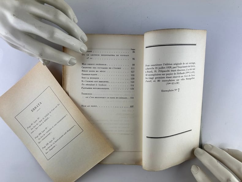 Paris Au Sans Pareil 1928, in-8 (12,5 x 19,5cm), broché 203p. Edition originale. Un des 20 premiers exemplaires (n°7) réservés aux Amis du Sans Pareil, sur 40 ex. sur papier de Hollande. Suivant 80 ex. sur vélin Montgolier. Complet du feuillet d'errata. Exemplaire à toutes marges, non coupé. Très bon état.