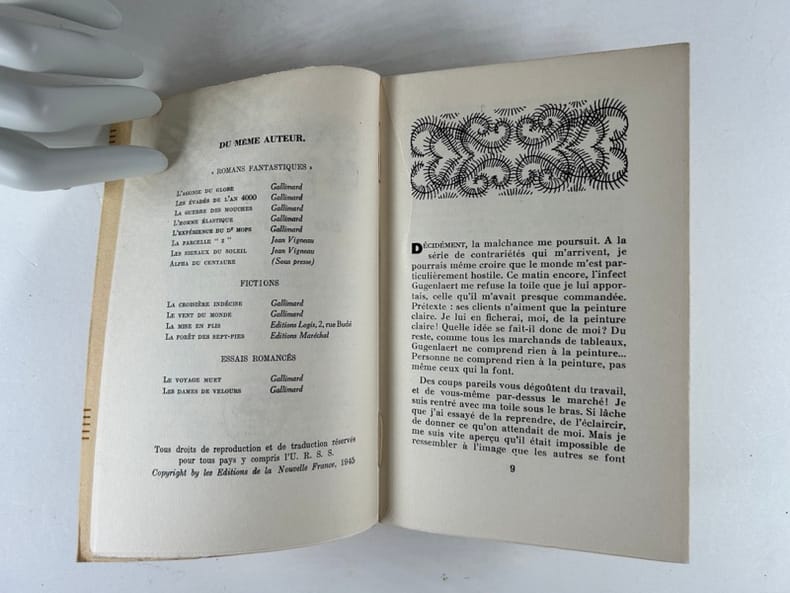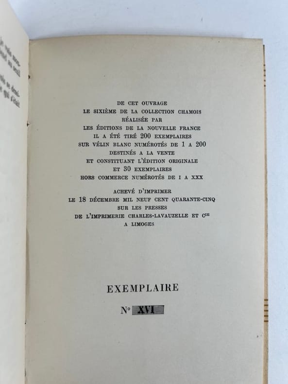 Paris Editions de la Nouvelle France/ Coll. Chamois 1945, in-12 (12x19cm), broché, couverture à rabats, 193p. Edition originale. Un des 30 ex. HC après 200 ex. sur vélin. Frontispice et illustrations en noir. Non coupé. Très bon état.
