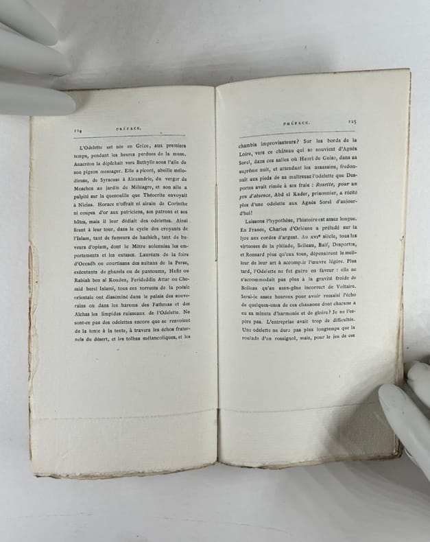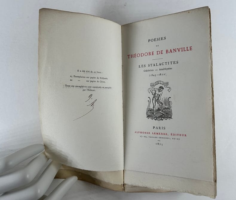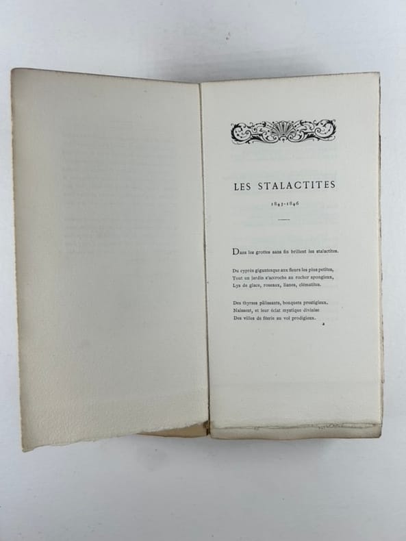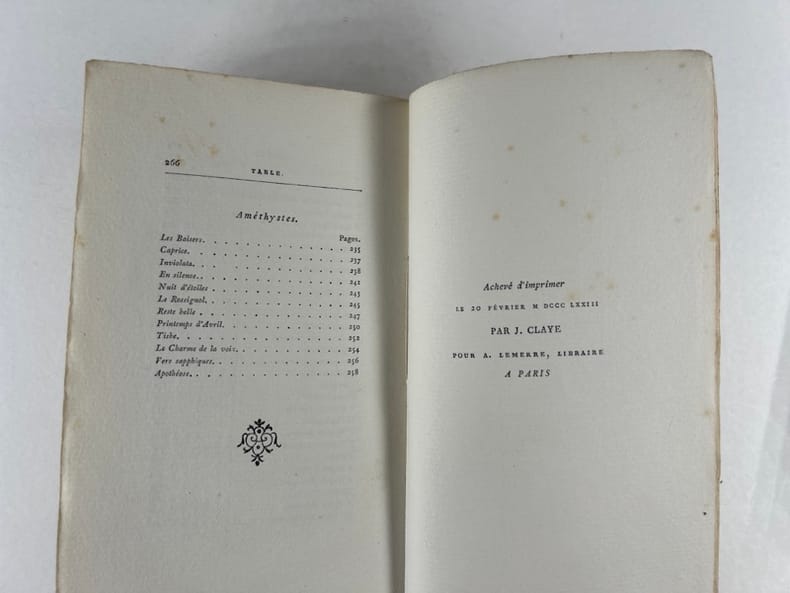 Paris Alphonse Lemerre 1873, (9,5x19cm), broché, 266p. Tirage de tête. Exemplaire numéroté (9) et parafé par Alphonse Lemerre. Non rogné, ni coupé. Couverture présentant des marques du temps avec un petit manque angulaire sur la deuxième plat. Intérieur de toute fraîcheur.