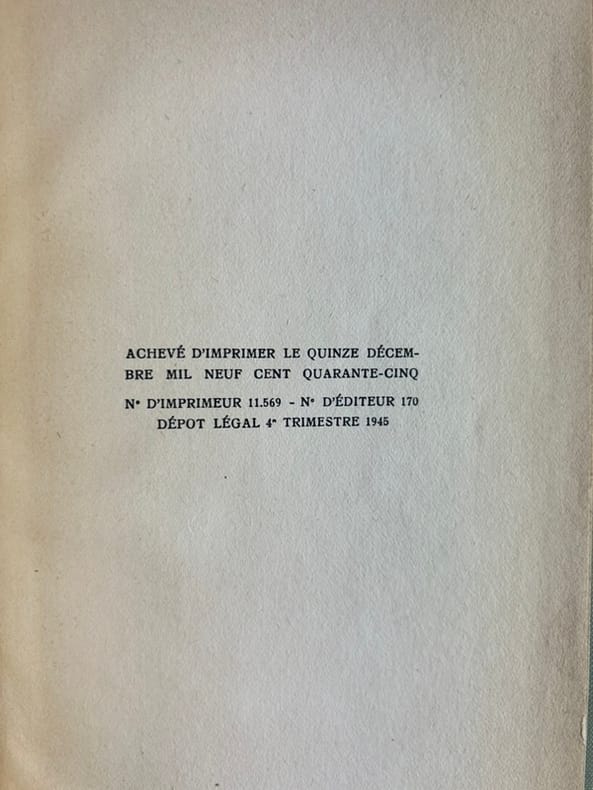 Paris Denoël 15 décembre 1945, 12,5x19cm, cartonnage éditeur vert, 348p.