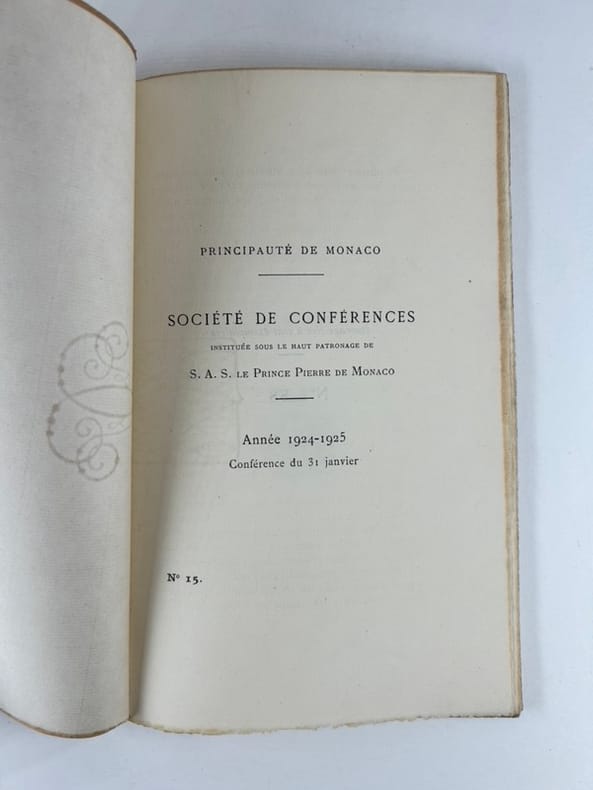 Monaco Société de Conférences 1925, in-8, broché, 48p. Edition originale de cette plaquette justifiée à 100 ex. imprimée sur vergé.