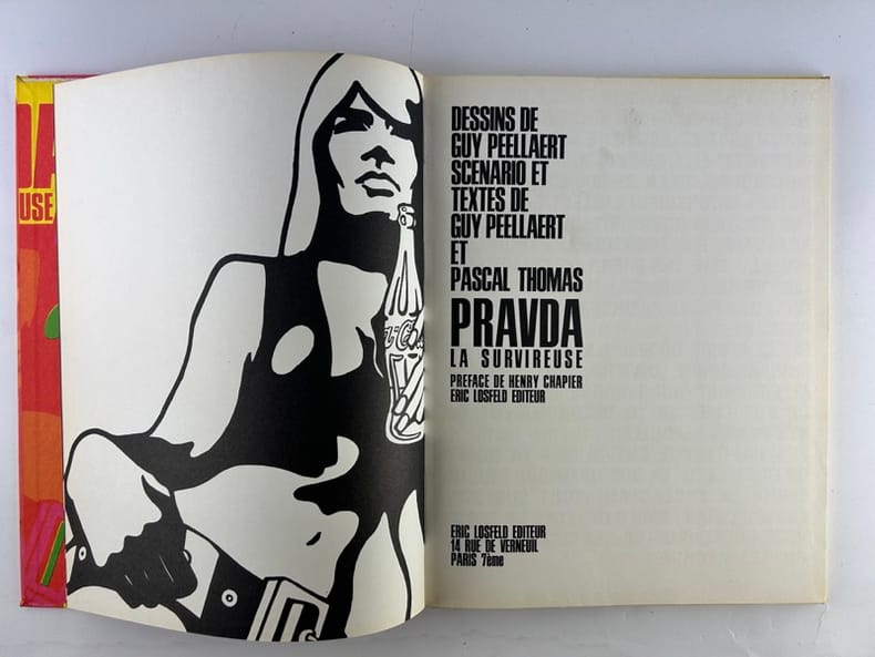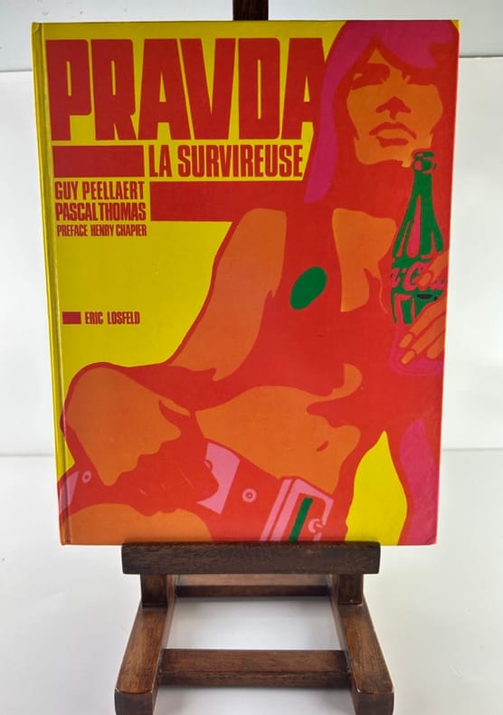 Editions Eric Losfeld 1968. In-4 cartonnage éditeur de 72 pages au format 29,5 x 22,5 cm. Couvertures illustrées. Dos carré. Plats et intérieur frais, malgré de presques imperceptibles tassements aux coins. Couverture, pages de gardes, dessins et scénario de Guy Peellaert, aidé pour ce dernier par Pascal Thomas. Préface d'Henry Chapier pour cette " Bible " du Pop-Art. Françoise Hardy servit de modèle pour l'héroïne. Edition originale. Rare, surtout dans un tel état de fraicheur.