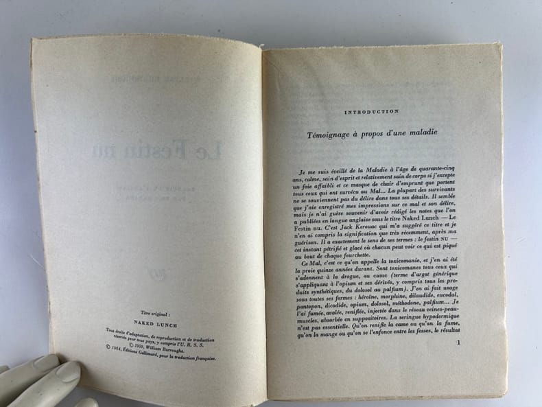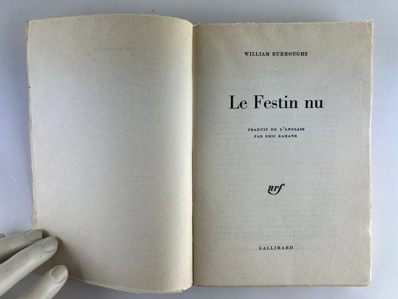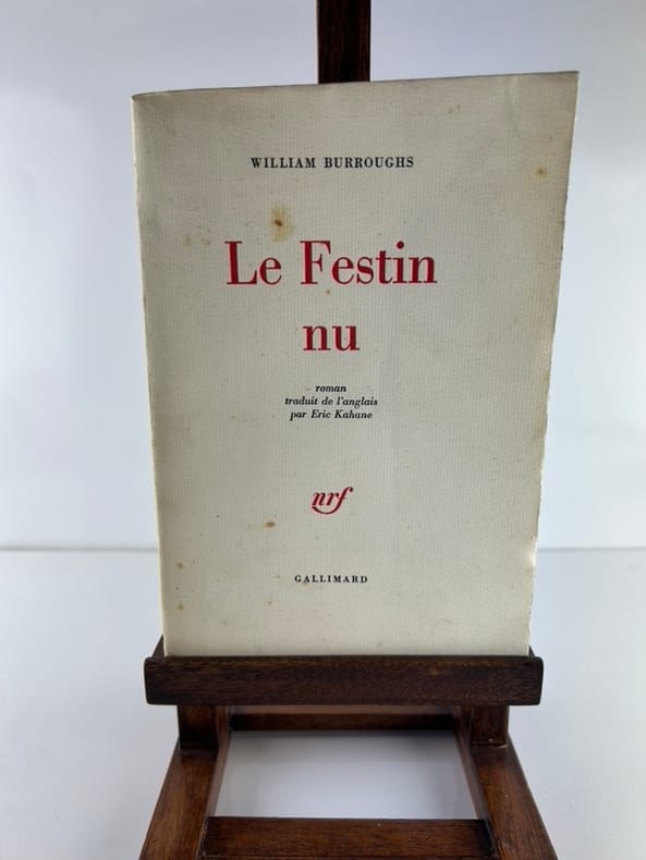 ed. Gallimard 1964 in-8 br., couv. rempliee, traduit par Eric KAHANE, introduction de l’auteur « Le Festin nu est fatalement brutal, obscene et repugnant. La maladie et ses details cliniques ne sont pas pour les estomacs delicats », edition originale numerotee sur velin bouffant des papeteries Teka (il n’est pas annonce de grand papier), couv. et dos tres tres legerement jaunis