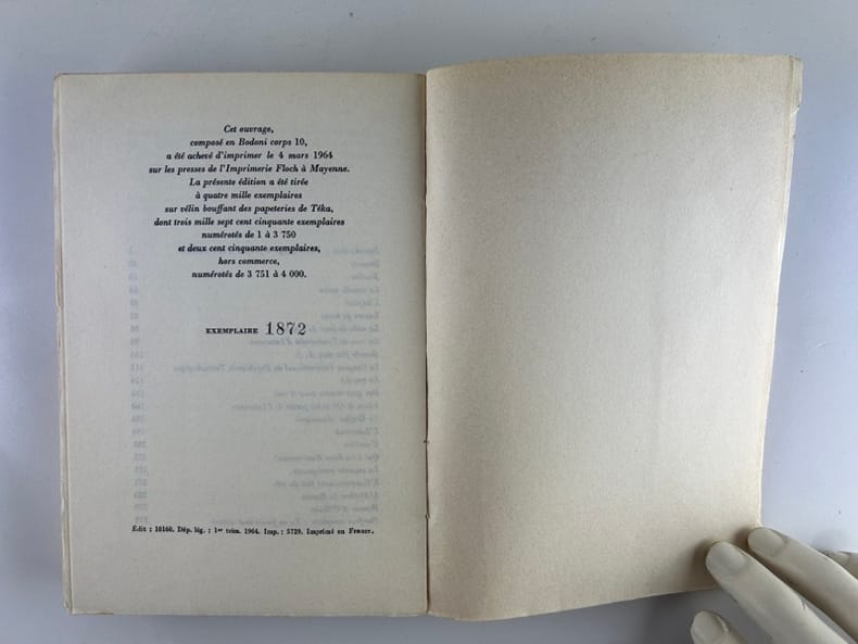 Gallimard , NRF 1964 In-8 broché couverture rempliée. 20,7 cm sur 14,2. 255 pages. Couverture poussiéreuse, passée et tachée, dos effrangé en pied, intérieur frais. Tirage à 4000 exemplaires. Exemplaire 1266/3750 sur vélin bouffant des papeteries de Téka. État correct d’occasion.