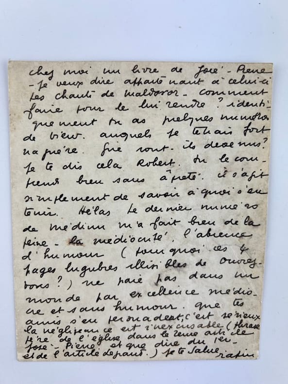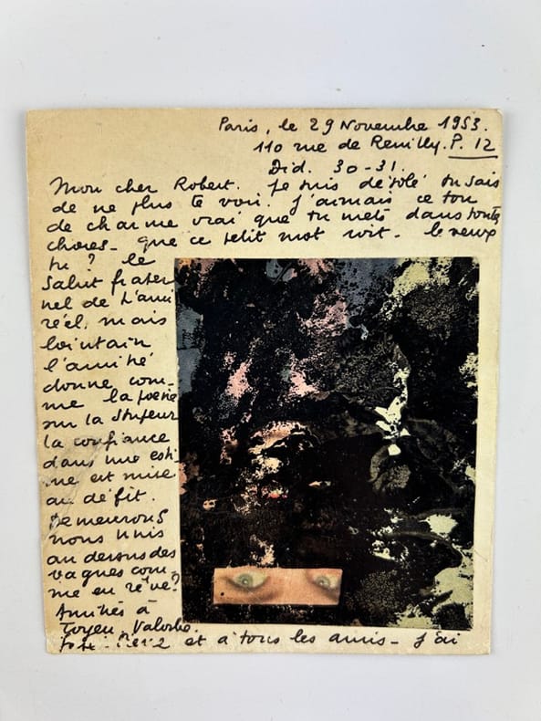 Paris 11x13 cm pour le carton et 7,5x 9cm pour l'illustration . Extrait : Mon cher Robert, Je suis désolé tu sais de ne plus te voir. J'aimais ce ton de charme vrai que tu mets dans toutes choses. Que ce petit mot soit, le veux-tu ?, le salut fraternel de l'ami réel mais lointain. L'amitié donne comme la poésie sur la stupeur. La confiance dans une estime est mise au défi. Demeurons-nous unis au dessus des vagues comme en rêve ? Amitiés à Toyen, ..., José Pierre et à tous les amis. J'ai chez moi un livre de José etc....