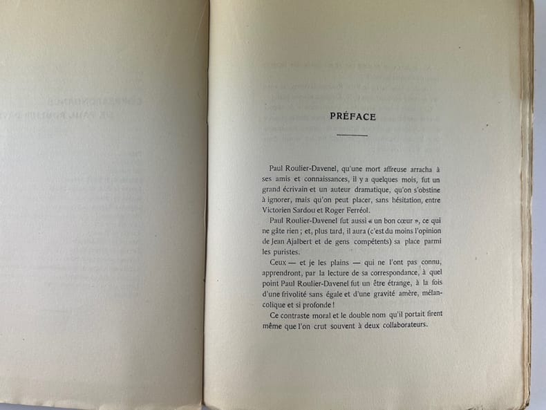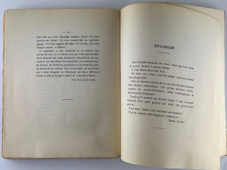 A la suite du décès de son ami imaginaire Paul Roulier-Davenel, Sacha Guitry a décidé de publier les lettres qu'il aurait reçues de lui à partir de 1903, pour notre plus grand plaisir : des détails amusants sur des personnes célèbres, Paris et Monte Carlo. Egalement des lettres de Paul Roulier-Davenel enfant à sa famille. Cet écrivain, grand séducteur, aurait été le précurseur de Francis Jammes.
