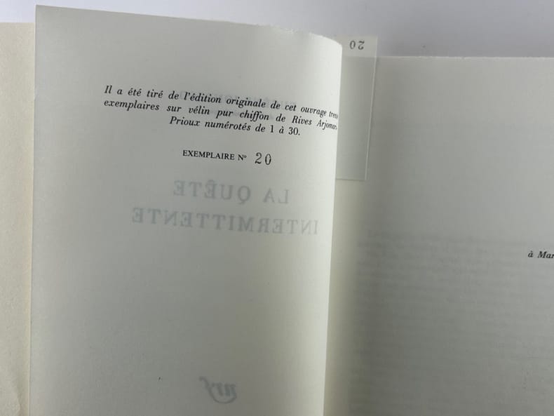 Paris Gallimard, Collection Blanche 1987, in-8, broché, 168p. Edition originale. N°20/30 sur vélin pur chiffon de Rives Arjomari-Prioux, seul tirage. Hormis une tache angulaire sur les trois dernières pages, bel exemplaire, de toute fraîcheur.