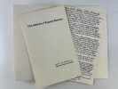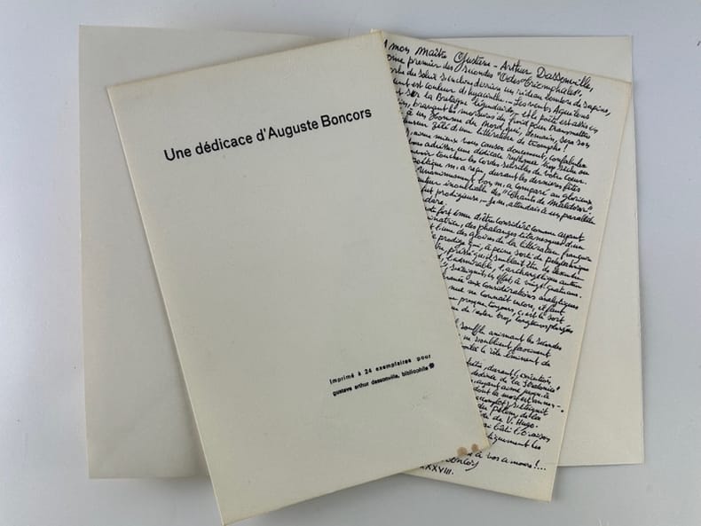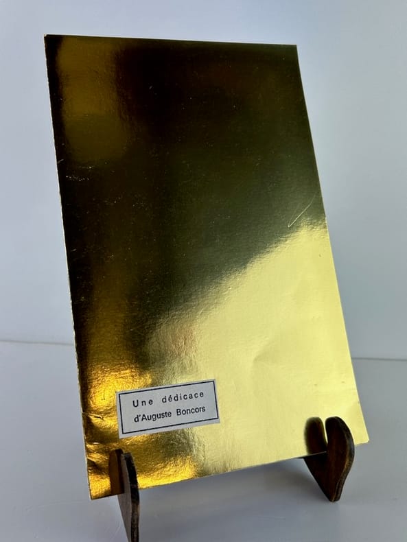 1970, 14 x 22,5 cm, 2p. Imprimé à 24 exemplaires pour Gustave Arthur Dassonville, bibliophile. Deux feuillets sous couverture dorée, avec vignette de titre contre collée, contenant une page de titre & le fac-similé d'une lettre à Gustave Arthur Dassonville de 1938. A l'écriture entre 1937 et 1939 des "Odes triomphales", Auguste Boncors y évoque l'enivrante surprise de l'accueil favorable reçu pour la première partie de son recueil, où le "tout Paris poétique" le compare au "glorieux Lautréamont".