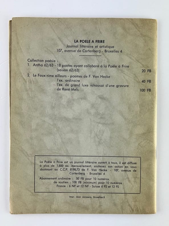 bruxelles Editions PAF (La Poele à Frire), Journal littéraire et artistique 1963., in-8, agrafé, 29p. Tiré à 400 exemplaires ordinaires et 50 ex. de luxe rehaussés d'une gravure de René Mels. Un des 400ex .ordinaires. Cachet sur la couverture. Bon état.