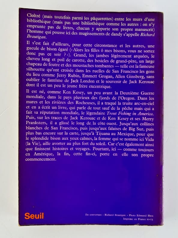 Ed. du Seuil, 1973. In-8 br. Traduit par G. Renard. Photo de Brautigan sur le premier plat par Edmund Shea. E.O.