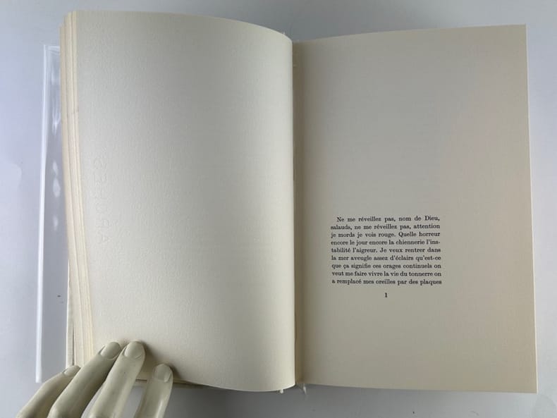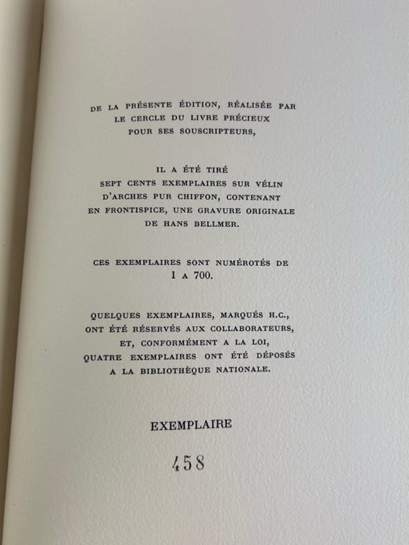 Paris, Cercle du Livre Précieux, 1962, in-8, 250x170mm, pleine reliure éditeur de tabis blan, titre à l'or au dos et estampé à froid sur le premier plat, sous étui, 110 pages. Un des 700 exemplaires numérotés sur vélin d'Arches pur chiffon. Bel état.