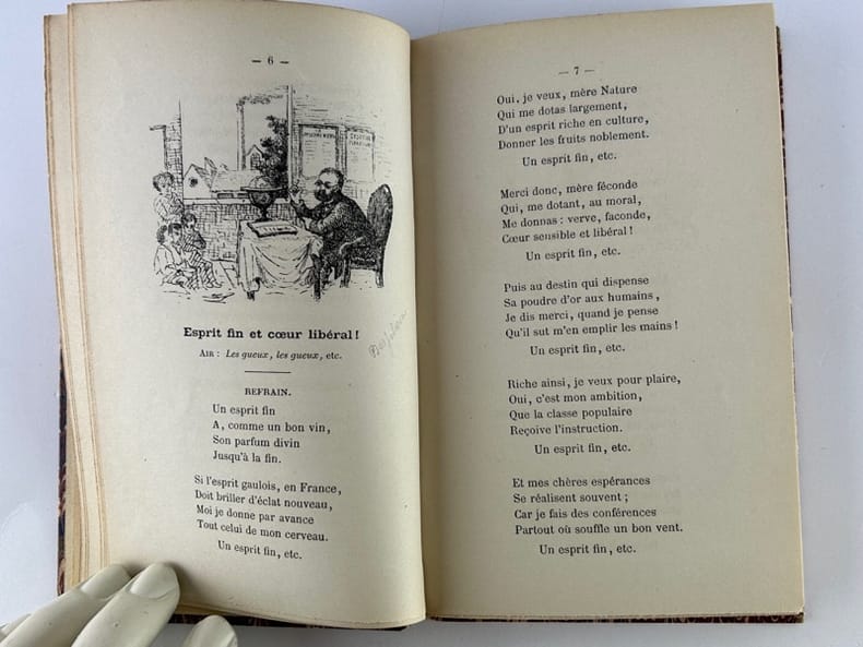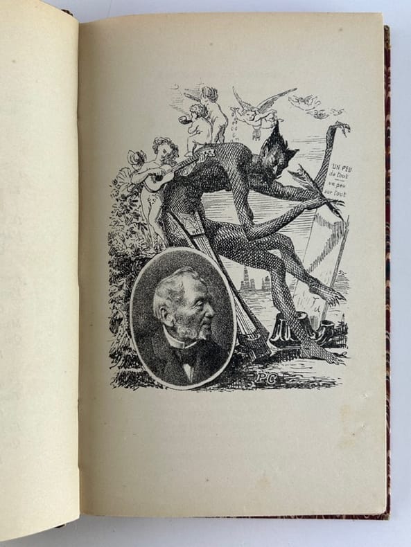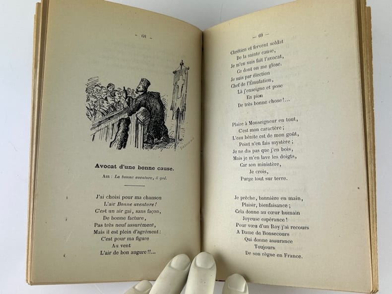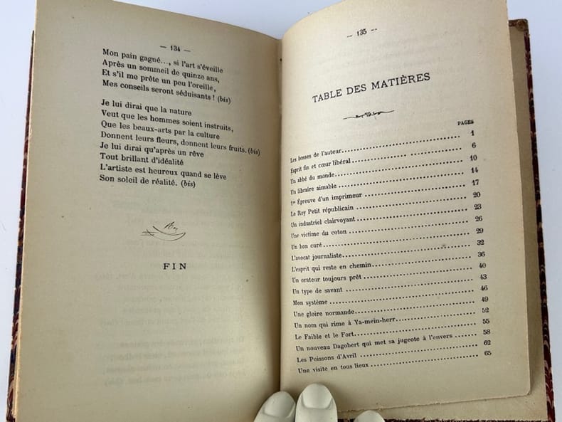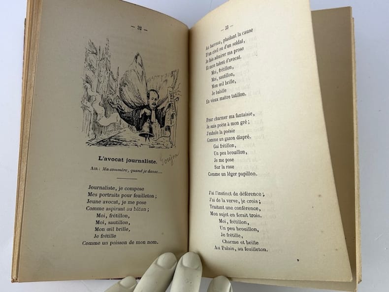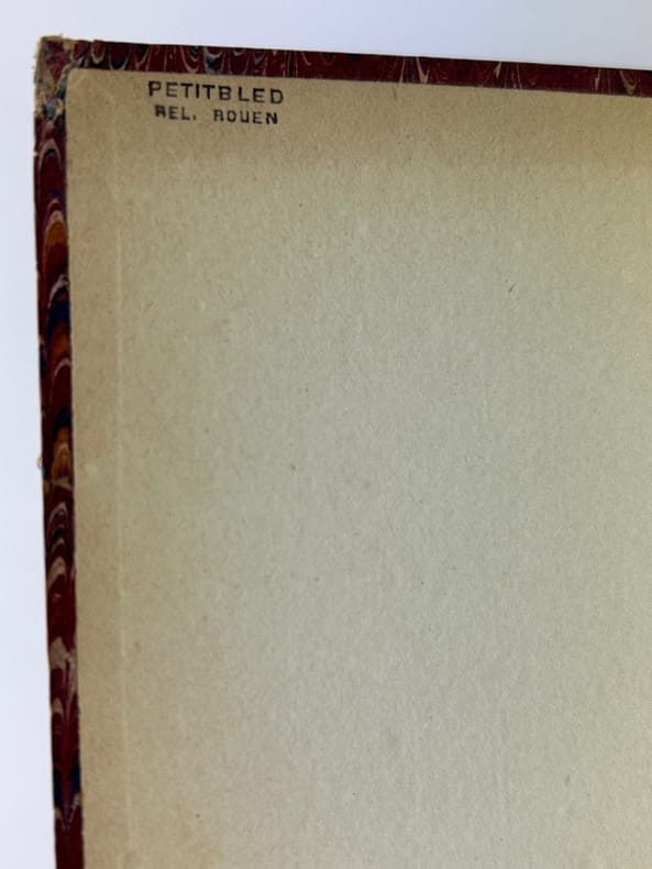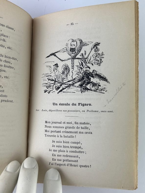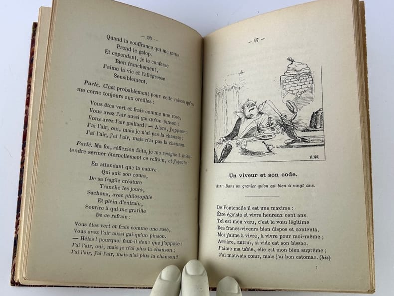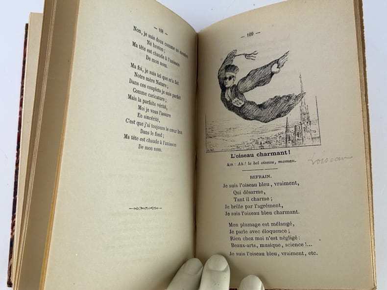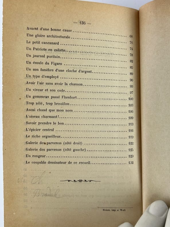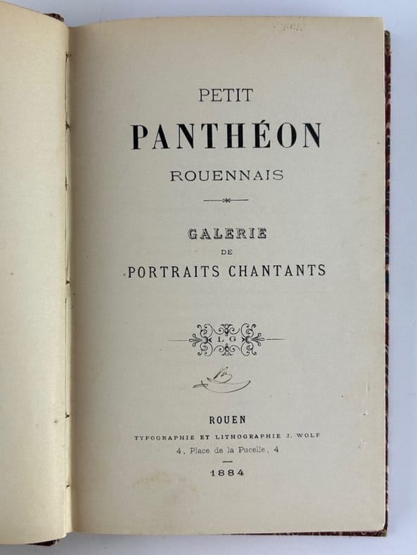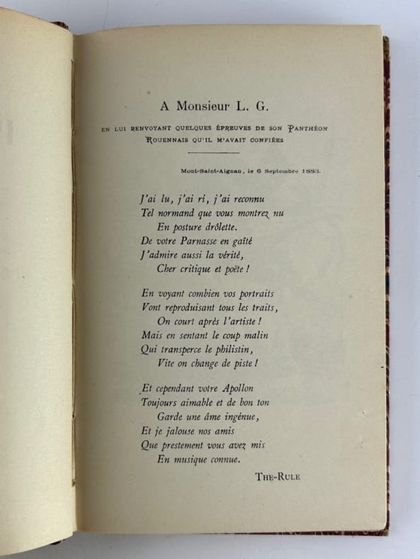 Rouen Typographie et lithographie J. Wolf 1884, 11 x 18 cm, reliure bradel plein papier peigné fin de l'époque, pièce de titre cuir, 136p. Reliure signée Petitbled, à Rouen (atelier fondé en 1855). Devinettes en chansons facétieuses et satiriques sur les personnalités rouennaises de l'époque (un lecteur aura noté quelques noms à côté des titres). Une gravure H.-t. signée PC et une illustration en tête de chaque chant. Bon état. Peu courant.