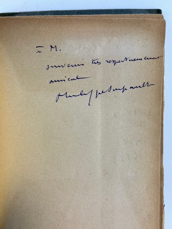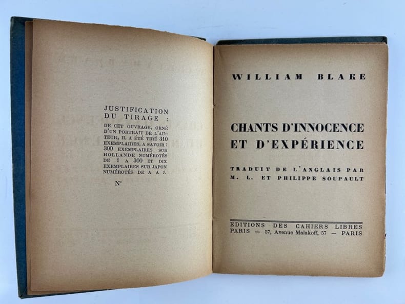Paris Aux Editions des Cahiers Libres 22 juin 1927 14,5x19,5cm broché sous couverture rempliée 88p. Portrait de l'auteur en frontispice. Dos éclairci. ENVOI DE PHILIPPE SOUPAULT. Nom du dédicataire effacé.