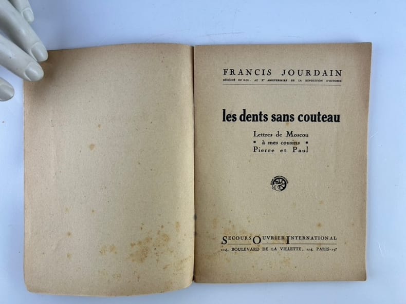 "Francis Jourdain était l’un des fondateurs des Amis de l’URSS dont il fut élu président d’honneur avec Henri Barbusse. À ce titre, en 1927, à l’occasion du dixième anniversaire de la Révolution d’Octobre, il fut invité en Union soviétique en compagnie d’une délégation du Secours ouvrier international (SOI). À son retour en 1928, Jourdain publia un compte rendu de ses impressions dans Les Dents sans couteau et participa à la fondation de la revue L’Appel des Soviets. Il fut également membre fondateur de la section française du Secours rouge international en 1926 (elle devint Secours populaire de France en 1936). Durant l’entre-deux-guerres, Francis Jourdain écrivait notamment pour l’Humanité, La Vie ouvrière, Le Monde, Ce soir et Commune. " Source Le Maitron