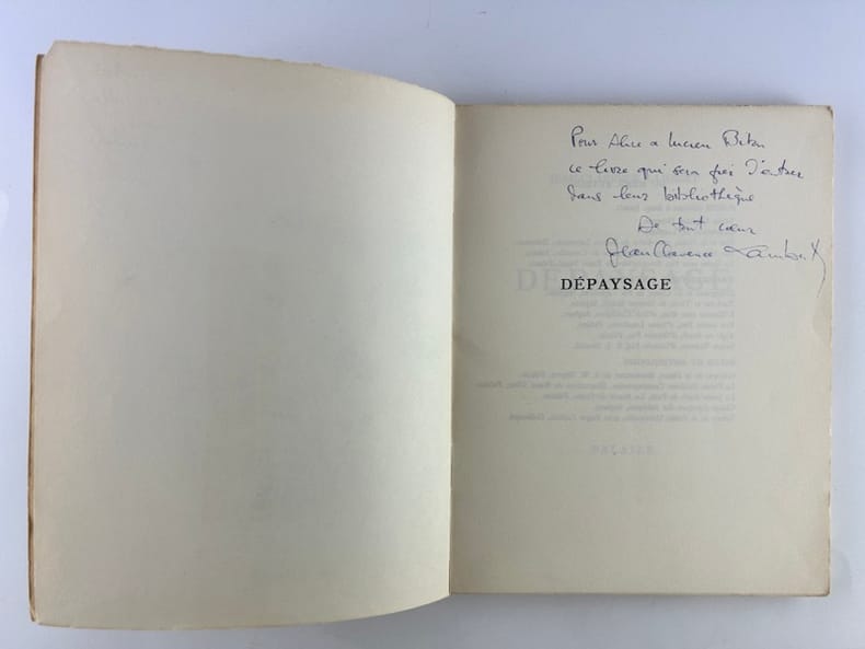 Paris, Falaize - Georges Fall, impr. Priester - Mourlot frères, à Paris 1959 In-8 22,5 x 17,5 cm. Broché, couverture beige, auteur & titre en noir sur le dos et le premier plat de couverture orné d’une lithographie originale de Soulages, 94 pp., table. Édition originale tirée à 810 exemplaires. Celui-ci, N 48/750 sur Fleur d’Alfa numérotés, sans la lithographie, enrichi d’une lettre et d’un envoi autographes de l’auteur. Accrocs en pied et en tête dos, couvertures avec pliures angulaires. [Seuls, les 60 exemplaires du tirage de tête sur papier vélin pur fil d'Arches, signé par l'auteur et par l'artiste, en sus de la couverture, sont ornés d’un frontispice et d'une lithographie originale à double page et à fond perdu de Pierre Soulages]