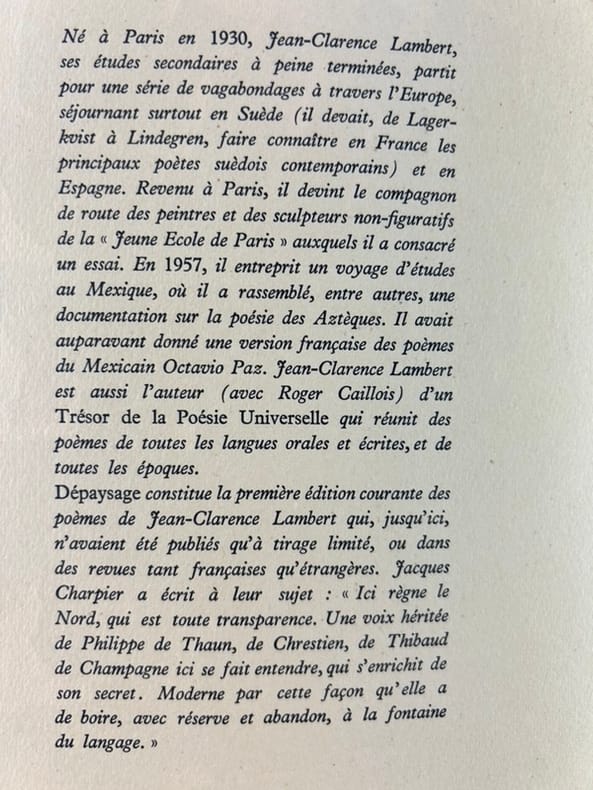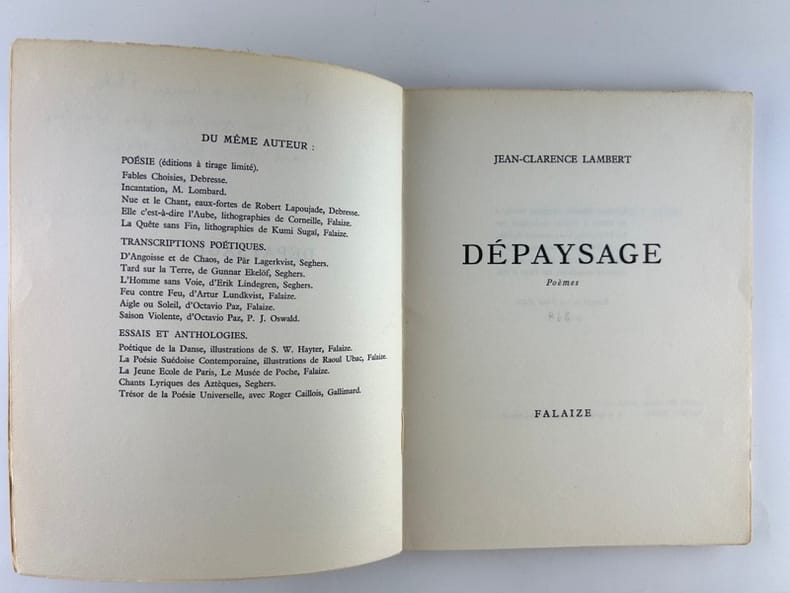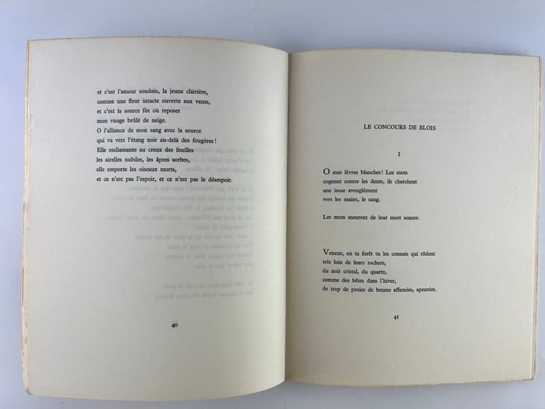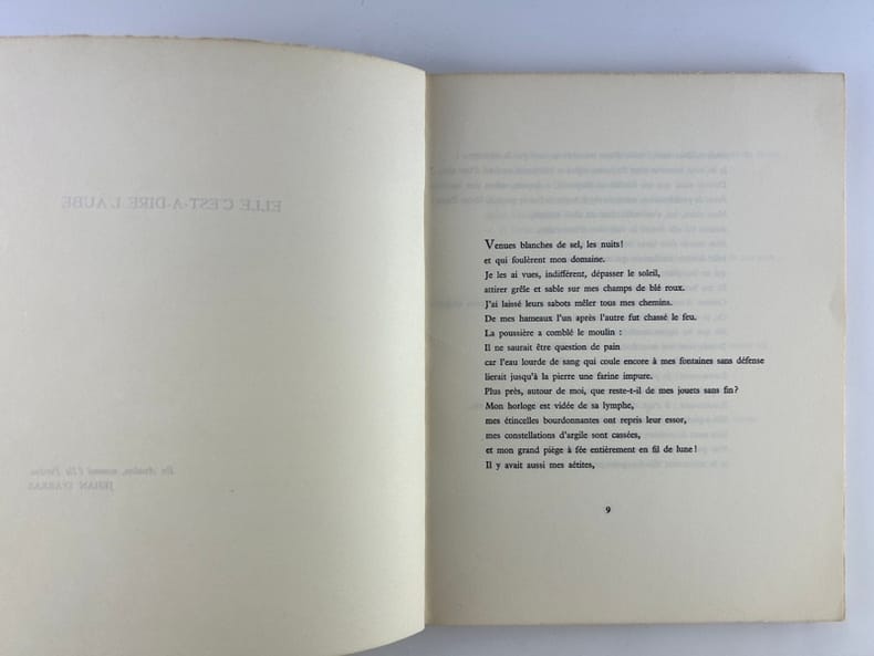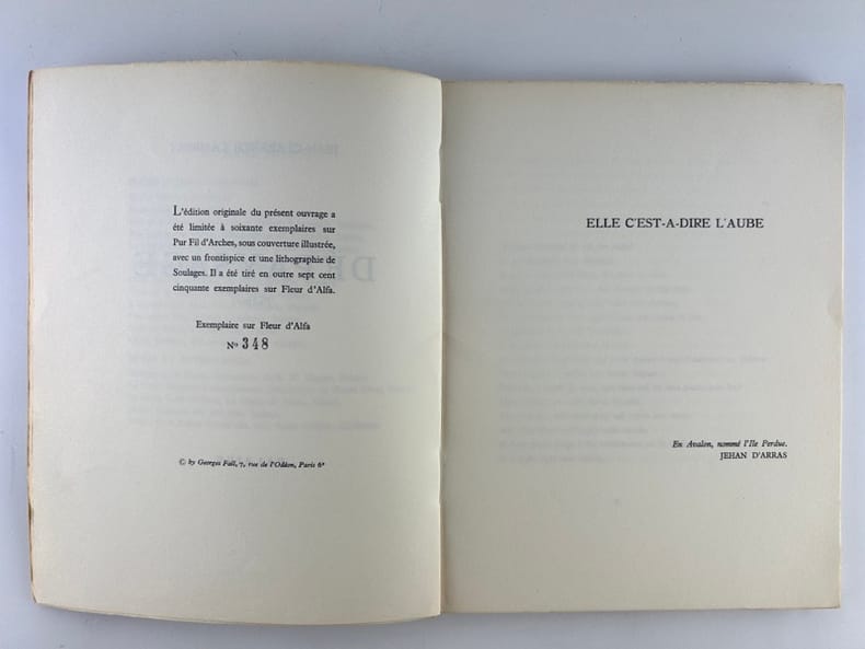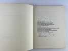 EDITION ORIGINALE publiée par Georges Fall. Composition en couverture de Pierre Soulages, dont c'est le premier livre illustré. Tirage à 810 exemplaires numérotés. Un des 60 premiers sur pur fil d'Arches, en feuilles, contenant 3 LITHOGRAPHIES originales de Pierre SOULAGES : une en couverture, le frontispice et une sur double page. Ce tirage de tête est signé par l'auteur et l'artiste. >JOINT la carte de visite de Soulages. Très bon 0