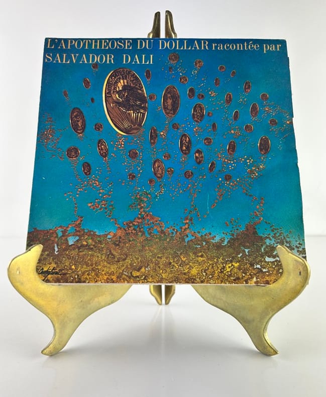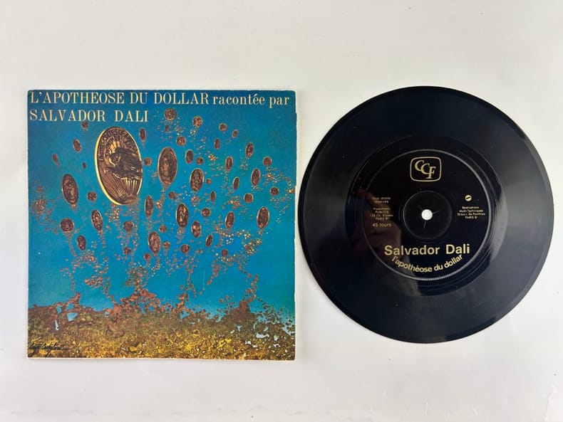 Commande passée par le Crédit Commercial de France au grand Maître du Surréalisme, Salvador Dali. Ce texte onirique, enregistré sur une face, fait référence à une peinture de l'artiste "L'Apothéose du dollar" datant de 1965. Le disque était distribué aux clients de CCF. Infimes usures et salissures à la pochette.