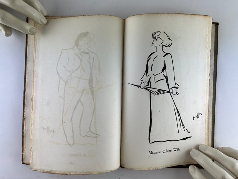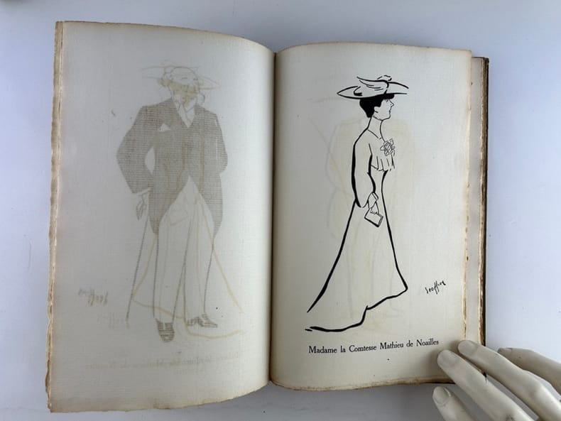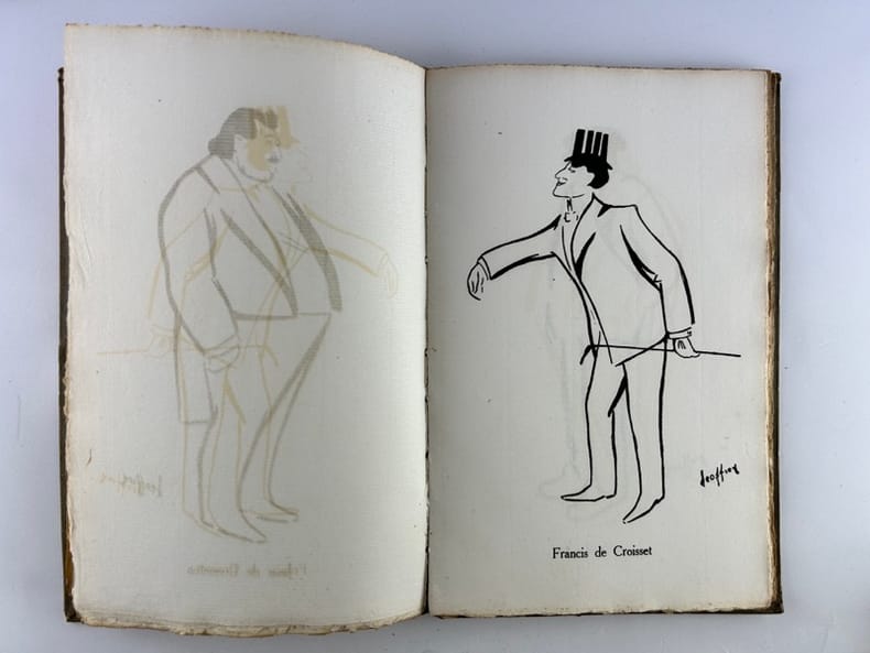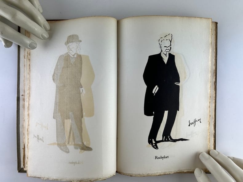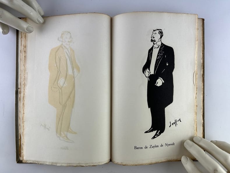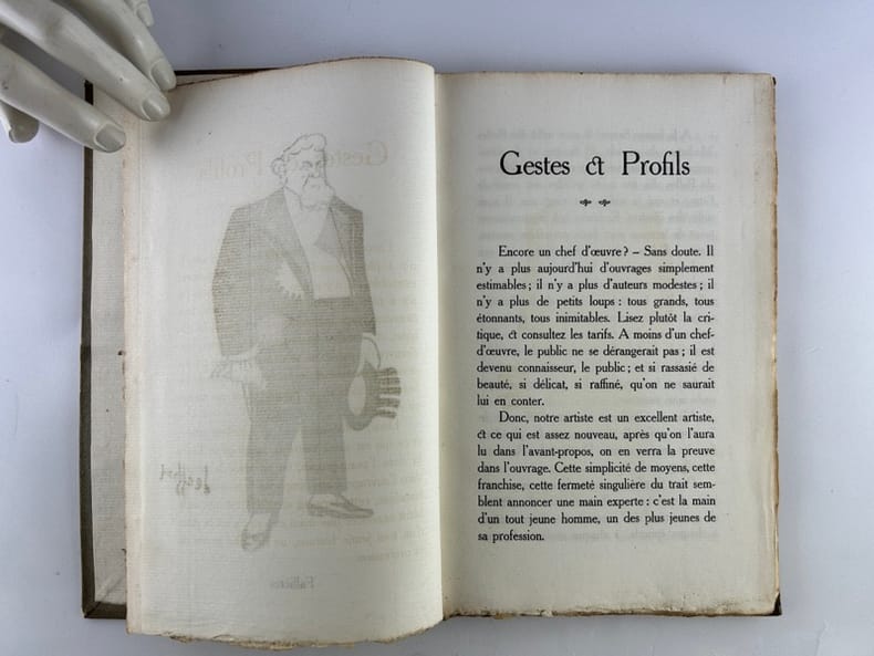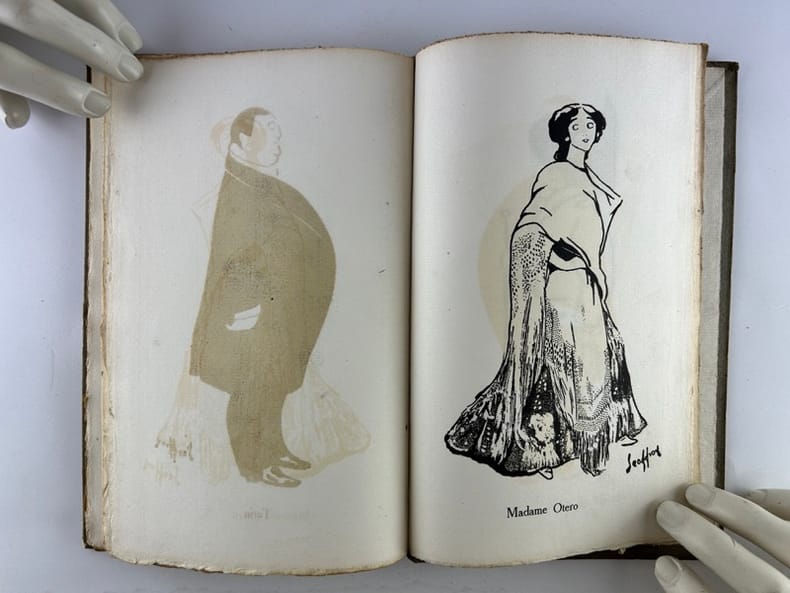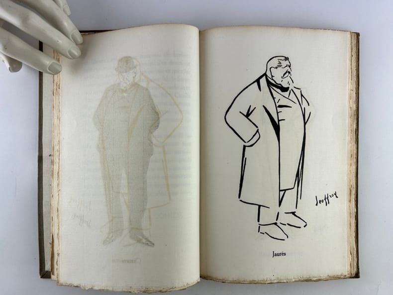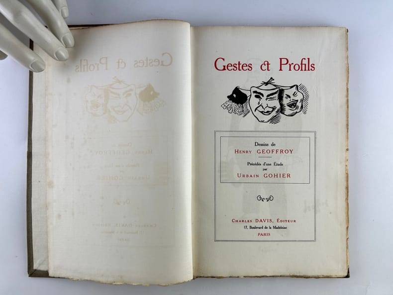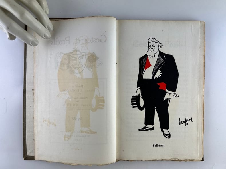 Paris Charles Davis Editeur 1906 16,5x26cm dos muet toilé gris, plates cartonnés, étiquette de titre en deux couleurs contrecollée sur le plat 10 pages de texte par Urbain Gohier & 36 planches hors-texte de portraits imprimés sur papier vergé non rogné à 500 exemplaires. Figurent : Fallières, Urbain Gohier, Clemenceau, Jaurès, Boni de Castellane, Lépine, Rochefort, Gustave Hervé, Ribot, Baron de Zuylen de Nyevelt, Marquise de Dion, Arthur Meyer, Comtesse Mathieu de Noailles, Maurice Donnay, Bernstein, Paul Hervieu, Charles-Henry Hirsch, Jean de Bonnefon, Francis de Croisset, Sardou, Jacques Richepin, Madame Catulle Mendès, Jules Clarétie, Mounet-Sully, Madame Bartet, Antoine, Cécile Sorel, Lucien Guitry, Madame Le Bargy, de Féraudy, Colette Willy, Torin, Otéro, Cléo de Mérode, Yvette Guilbert, (Henry Geoffroy). Premier plat présentant une tache sinon bon état.