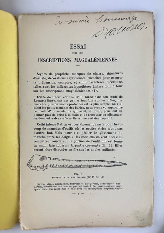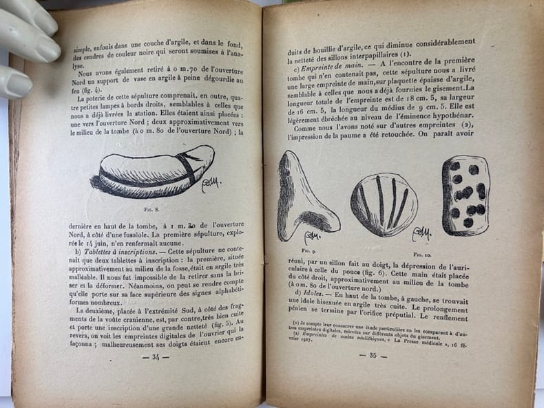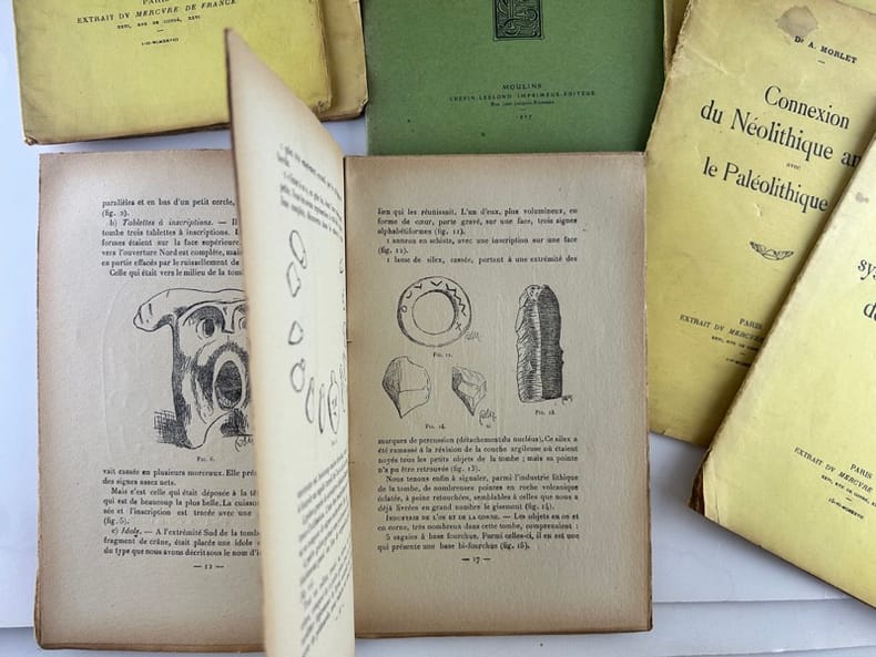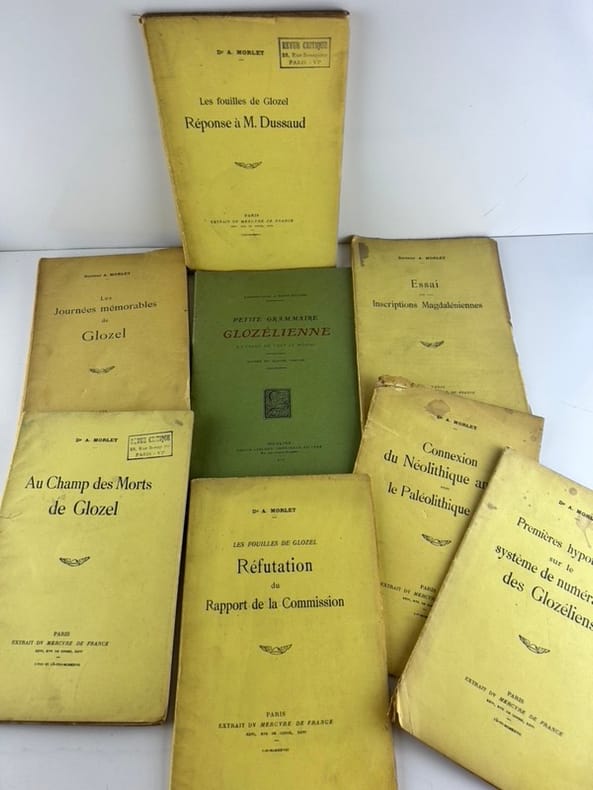Paris Mercure de France 1926-1929 in-8 broché 1- Les journées mémorables de Glozel, 1926, 53p. Envoi de l'auteur. 2- Connexion du néolithique ancien avec le Paléolithique final, 1927, 12p. 3- Au Champ des Morts de Glozel, 1927, 51p. Envoi de l'auteur. 4- Premières hypothèses sur le système de numération des Glozéliens, 1927, 9p. 5- Les fouilles de Glozel. Réponse à M.Dussaud, 1927, 41p. 6- Les fouilles de Glozel. Réfutation du Rapport de la Commission, 1928, 25p. 7- Essai sur les Inscriptions Magdaléniennes, 1929, 15p. Envoi de l'auteur. 8- Lieutenant-Colonel de Saint-Hillier : Petite Grammaire Glozélienne à l'usage de tout le monde. Divisée en quatre partie, Moulins, Crépin-Leblond, 1927, 63p. Tirage à 500 ex.