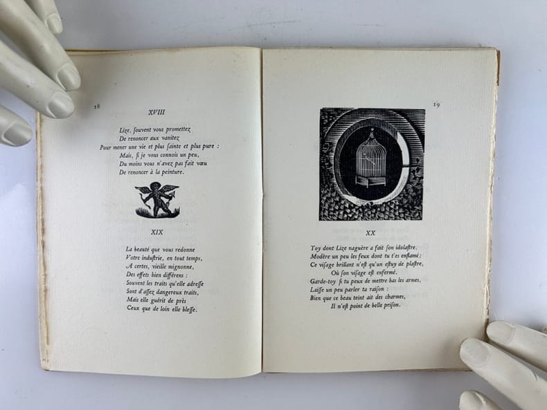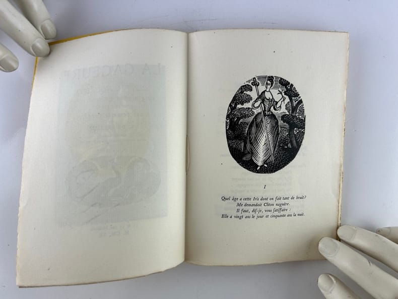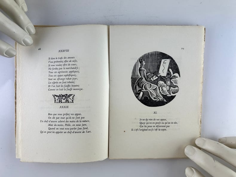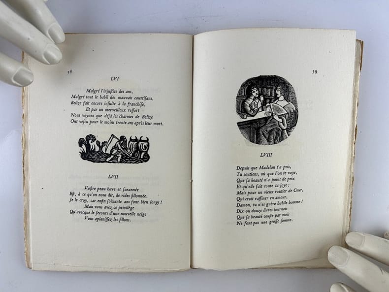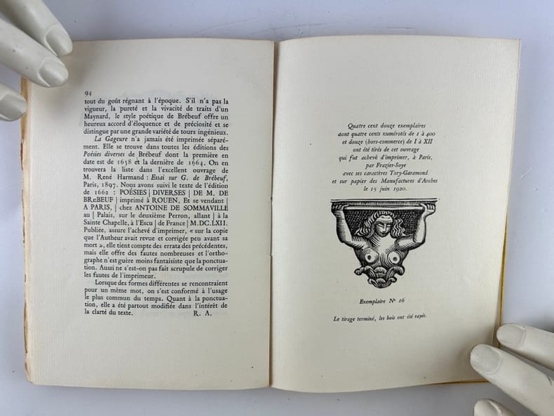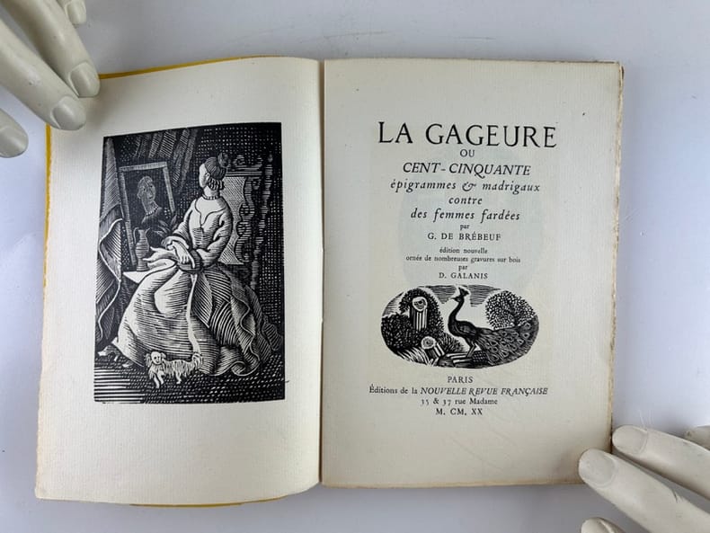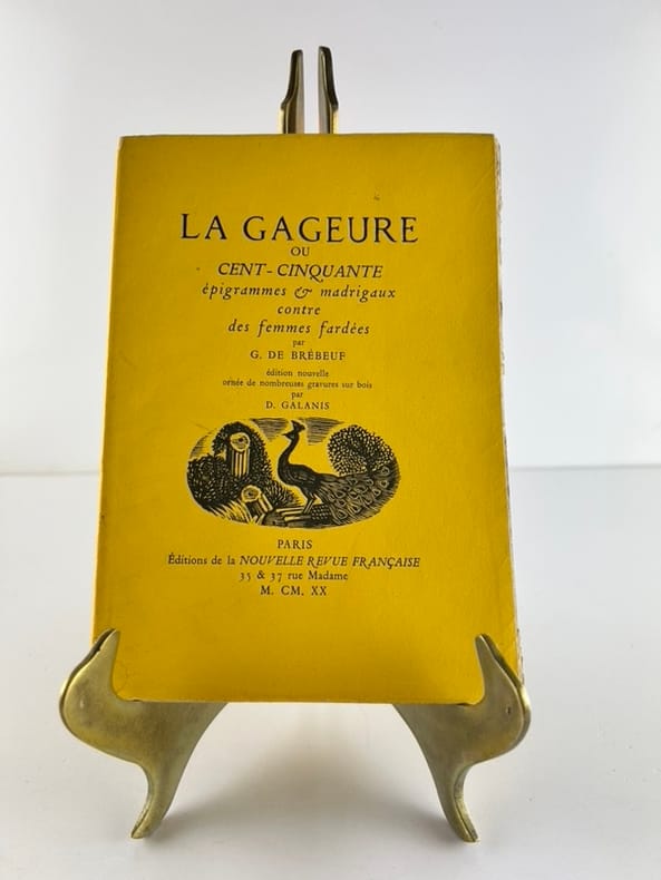 BREBEUF (G. de).La Gageure ou cent-cinquante épigrammes, & madrigaux contre les femmes fardées. Edition nouvelle ornée de nombreuses gravures sur bois par D. Galanis.P., La Nouvelle Revue Française, 1920, In-12, br., non rogné, non coupé, 94 pp. Tirée à 412 exemplaires numérotés sur Arches.