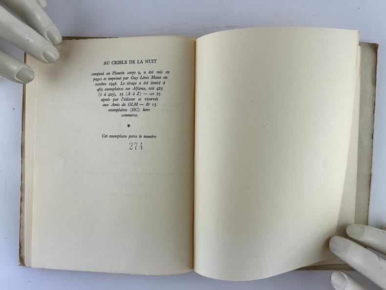 Paris GLM octobre 1948 14x19cm broché 53p. Tirage limité à 425 exemplaires sur Alfama, n°274, après 25 ex. réservés et 15 ex. hors commerce.