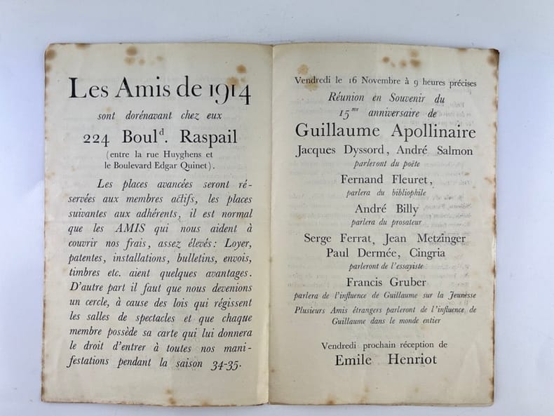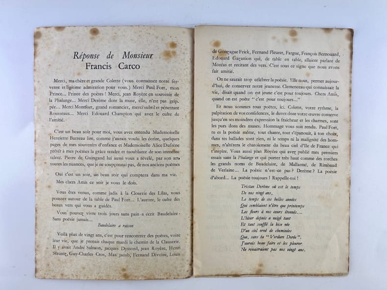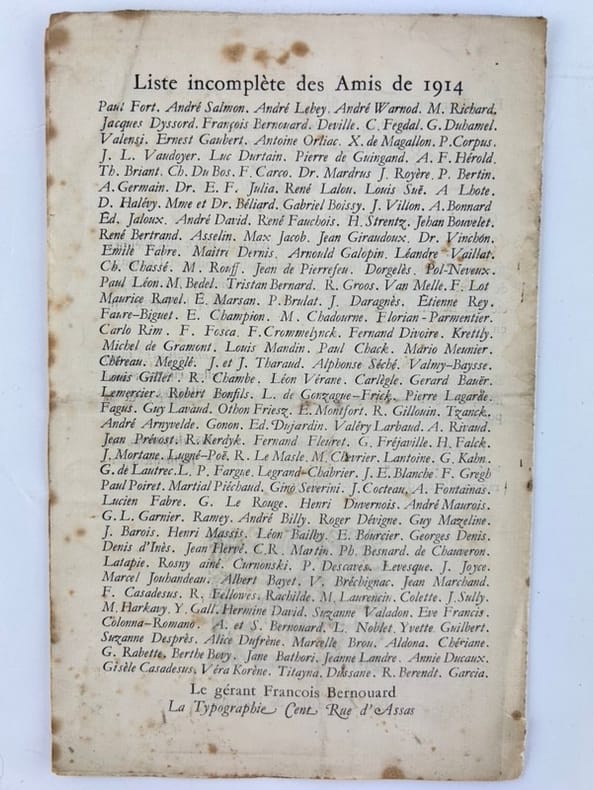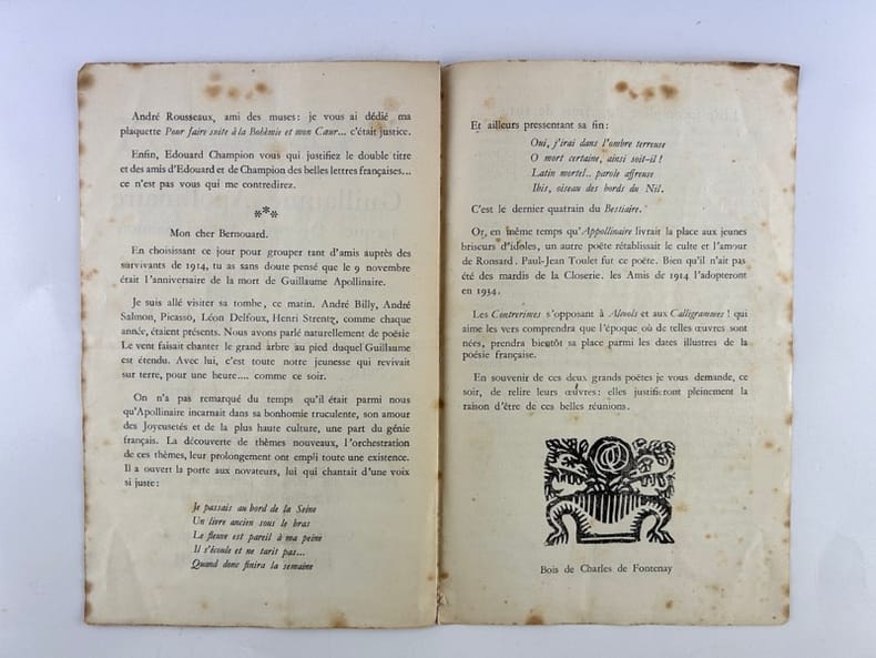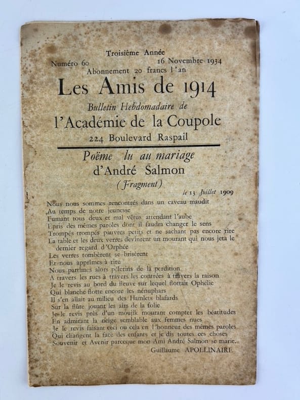 La Typographie / François Bernouard in-8 en feuilles 8p. Poëme lu au mariage d'André Salmon par Guillaume Apollinaire(fragment). Réponse de Monsieur Francis Carco. Bois de Charles de Fontenay. Liste des Amis de 1914. Rousseurs, principalement sur la première page.
