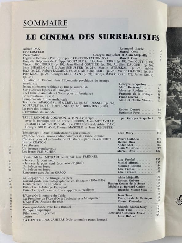 LE CINEMA DES SURREALISTESAdrien DAXRaymond BordeEric LOSFELDMarcel OmsPrésentationGeorges Roquefort et Alain MitjavilleLégitime Défense (Plas doyer pour CONFRONTATION XV)Marcel OmsEnquête. Réponses de Philippe SOUPAULT (p. 17), José PIERRE (p. 18), Tom GUTT (p. 19), Vincent BOUNOURE (p. 19), Jean-Michel GOUTIER (p. 20), Aurélien DAUGUET (p. 20), Jean BIRABEN (p. 21), Jean SCHUSTER (p. 21), Martin STEJSKAL (p. 22), Adrien DAX (p. 22), Robert LAGARDE (p. 24), Alain JOUBERT (p. 26), Victor CRASTRE (p. 28), Petr KRAL (p. 29), Georges GOLDFAYN (p. 30), Dionys MASCOLO (p. 32), Julien GRACO (p. 35)Situation du Cinéma dans l'Economie psychique du groupe surréalisteImage cinématographique et Image surréalisteSur quelques figures de l'imaginaire« A l'Echelle Animale » (Notes pour un bestiaire)Le surréalisme excédéCompléments à une AnthologieGeorges RoquefortMarc BertrandMaurice RoelensFrançois de la BretequeFranc DucrosAlain et Odette VirmauxTextes de : ARAGON (p. 85), CREVEL (p. 85), DESNOS (p. 86), SOUPAULT (p. 86), Pierre UNIK (p. 86), BRUNIUS (p. 88).La part des lionnesL'Invention du mondeTABLE RONDE de CONFRONTATION XV dirigéeRobert DesnosBenjamin Peretpar Georges Roquefortavec la participation de Franc DUCROS, Alain MITJAVILLE, Jo MARTI, Marcel OMS, Maurice ROELENS et de Adrien DAXGeorges GOLDFAYN, Dionys MASCOLO et Jean SCHUSTERTémoignage : Deux manifestations peu connuesJean MitrySynthèse des émissions radiophoniques de France Culture réalisées pour « Les lundis de l'Histoire » par Denis RICHETBuster KEATONLes AbyssesUn étrange rendez-vousLes frères FLEISCHERPierre GuibbertHélène 0msAndré AbetAlain MitjavilleMarcel OmsDossier Michel MITRANI réuni par Lise FRENKEL« Je » sur le pont neuf«Je » sur le pont neuf (scénario original)Un balcon en forêtUn balcon en forêtRencontre avec Julien GRACQLa Clepsydre. Une liturgie du pèreL'avant-garde cinématographique en Espagne (1926-1930)L'enterrement du StradivariusBuñuel ou L'Auberge EspagnoleBuñuel et quelques-uns de ses apports surréalistesL'Age d'Or à l'ombre du TeideLa Première de l'Age d'Or à Toulouse et à MontpellierL'Age d'Or. Analyse du récitCorrespondance avec Luis BuñuelPanique HispaniqueFilm vampire (poème)LettreLise FrenkelMichel MitraniMaurice RoelensLise FrenkelLise FrenkelAlain MitjavilleRoman Gubern ..Ramon Gomez de la SernaMichèle et Bernard GazierRicardo Muñoz-SuayJean TenaFrançois de la BretequeRoland CosendeyRicardo Muñoz-SuayJean TenaEmeterio Gutierrez AlbeloLuis BuñuelLA GAZETTE DES CAHIERS (voir sommaire pages jaunes)